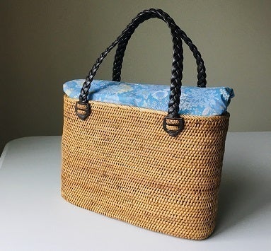 □ 22000円 中サイズのバッグ。淡い青の花柄もようの中布をお貼りします。飽きのこない、涼し げな色。サイズは横29cmマチ12cm高さ18cm。(手編みの為サイズに多少の違い があります)持ち手は汚れが目立たない本革の濃い茶にしました。