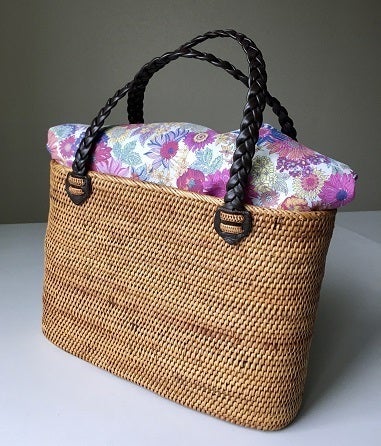 □ 22000 中サイズのバッグ。淡いピンクの花柄模様の中布をお貼りします。持ち手は汚れが目立 たない濃い茶にしました。サイズは横29cmマチ12cm高さ18cm。(手編みの為サイ ズに多少の違いがあります)1年間の保証付き。限定3個。