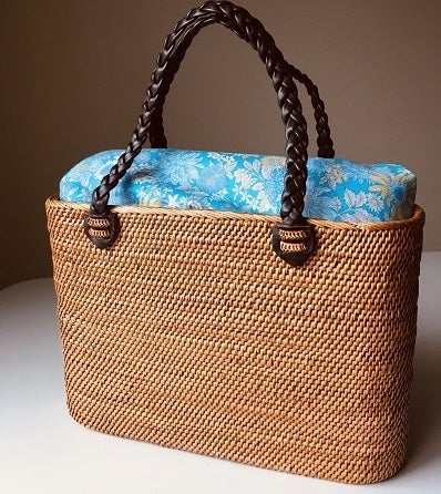 □ 15000円 涼しげなかごバッグ。中布が草色、茶、グレー、青、緑、薄い草色 など。