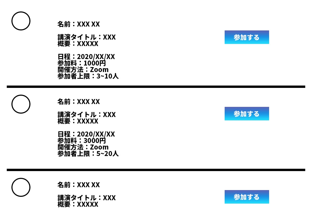 ①当サイトにて、講演者は参加料/最低人数・最高人数/日程/講演方法(場所)を設定します。