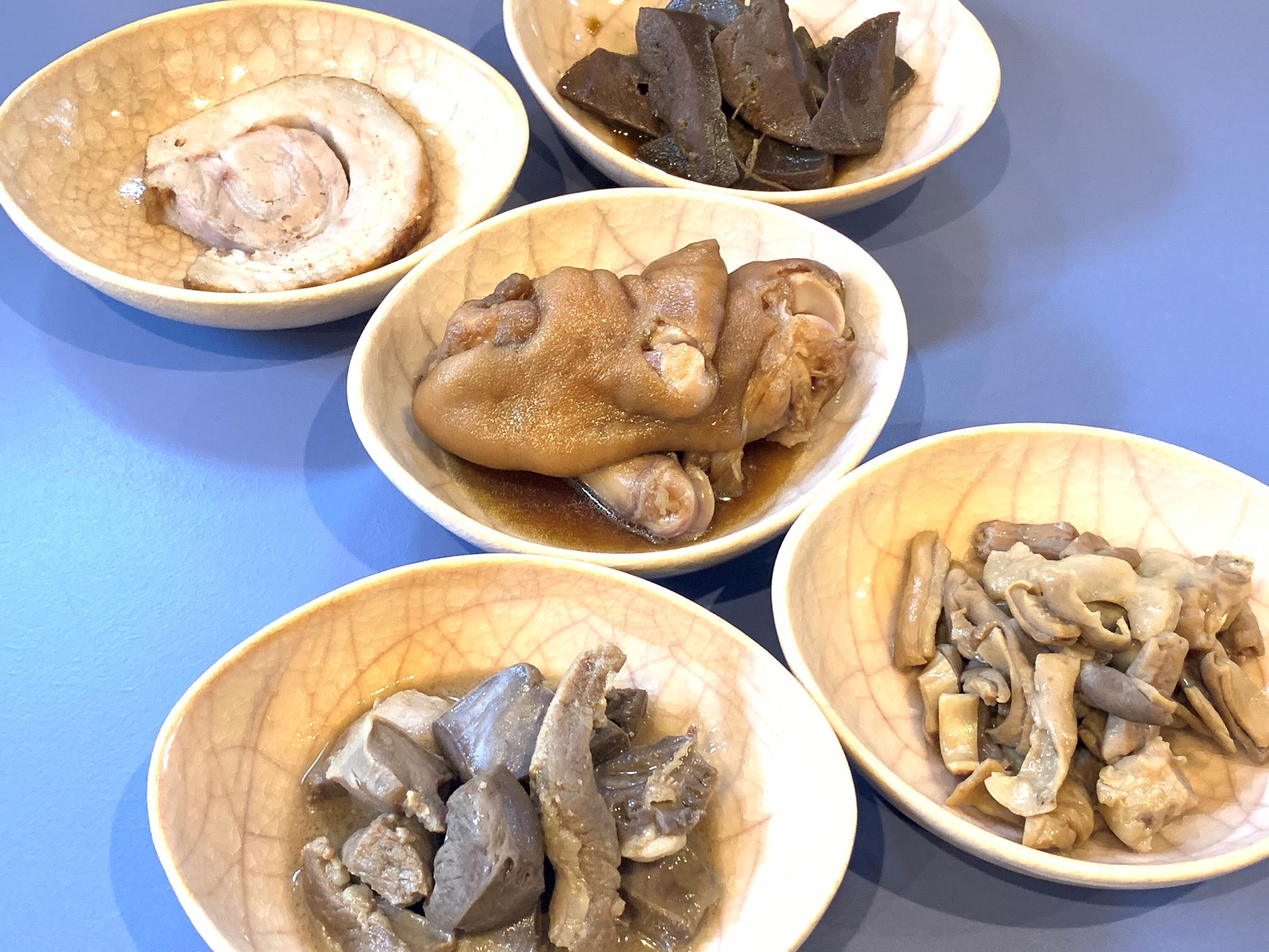 ミックスホルモン焼・なにわポーク味噌焼き・豚肝甘辛炒め煮・豚足煮・自家製ローストポーク