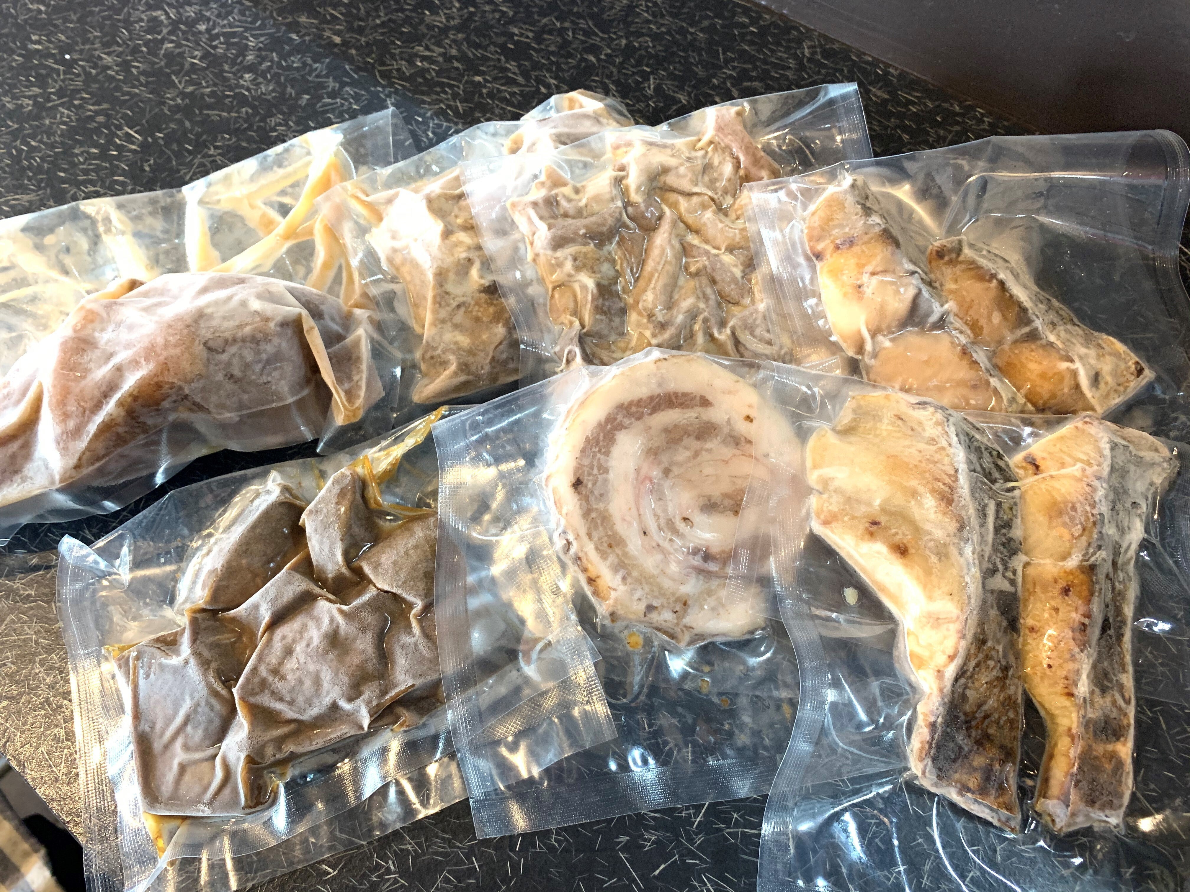 全ての料理は調理後、一人前づつ真空パックにしています。その後、加熱殺菌をして発送します。