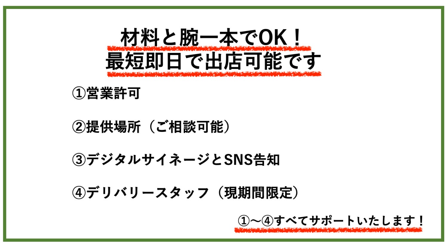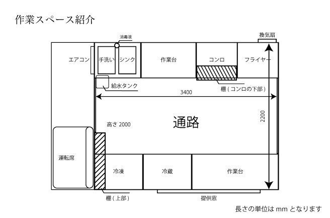用意するもの:お店の宣伝用フライヤー等、備え付けの厨房設備(設備内容予定をご覧ください)以外で必要な調理器具、食材、食品衛生責任者証