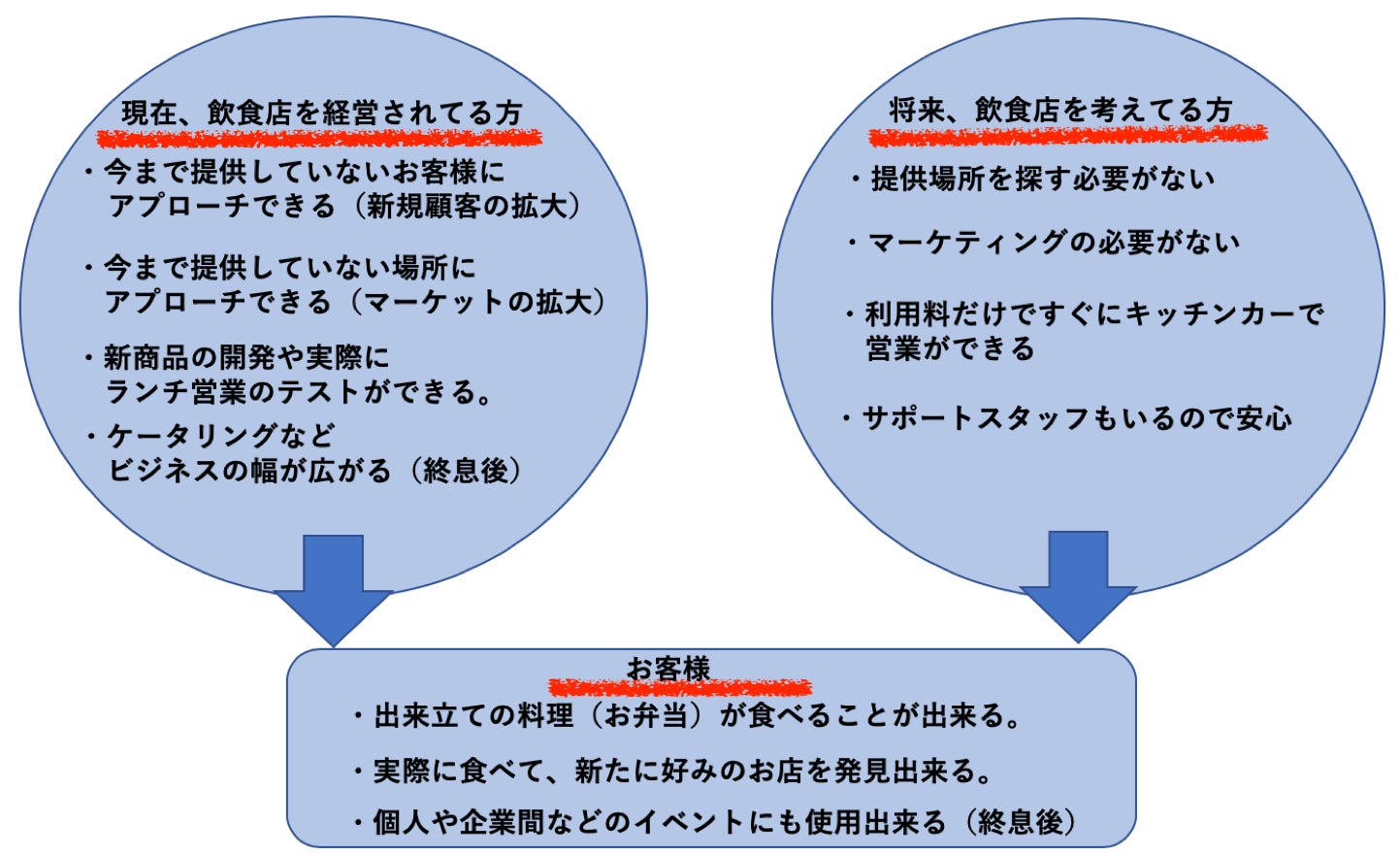 テイクアウトやデリバリーとは違い、料理のプロがその場で作る出来立ての美味しい料理や、お弁当を届けるサービスの仕組みを展開しようと考えています。