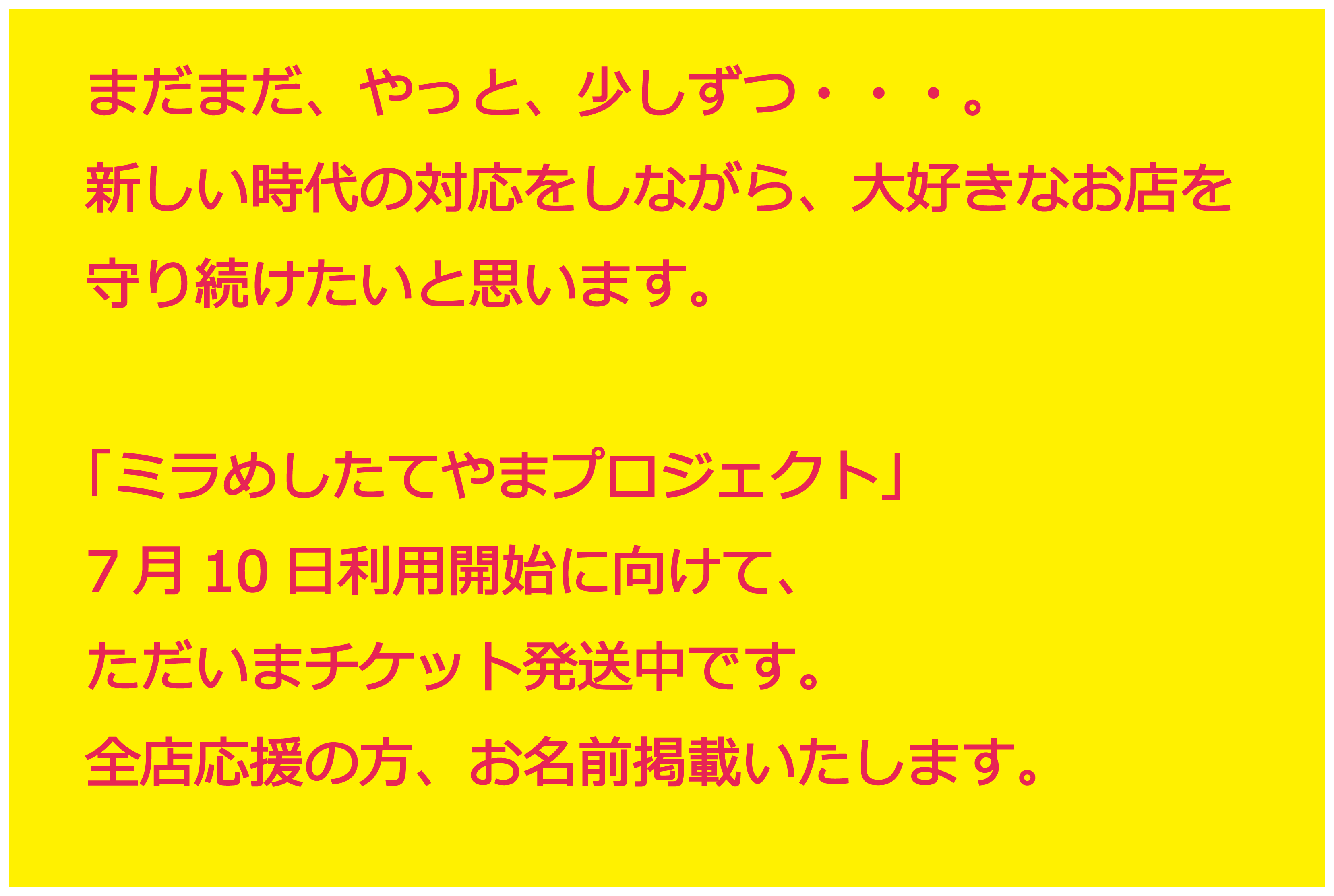 これは館山の飲食店経営者等の有志で、「ミラメシたてやまプロジェクト実行委員会」という発起人の仲間たちと相談して、ピンチを迎えていることになんとかしなければいけないと立ち上げたプロジェクトです。日々、刻一刻と社会情勢が変化するなかで、ご支援をお願いする思いです。