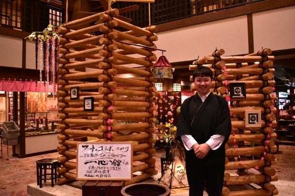 (ロビーにはスタッフ手づくりの日光杉と大谷石のオブジェ)