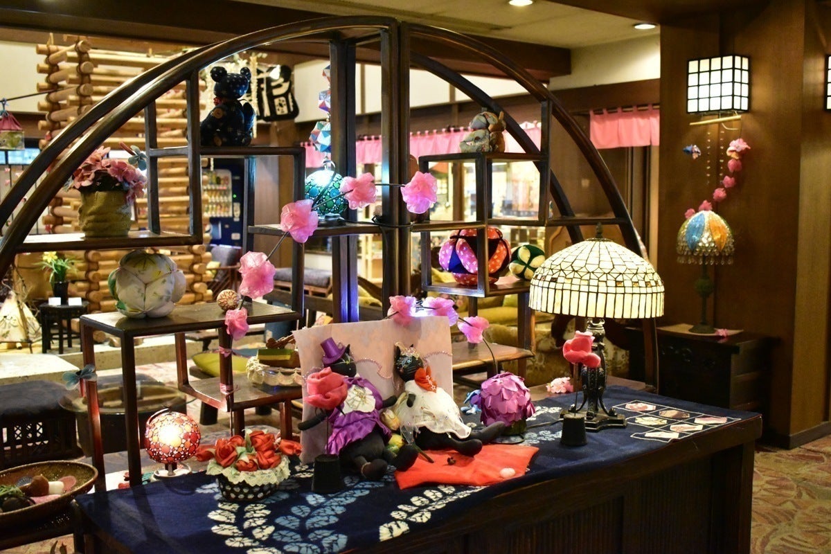 舘内にはスタッフによる手づくり品を飾っております。大きな「キャンプファイヤー」のような日光杉と地元名産大谷石(おおやいし)のオブジェ、ちりめん小物、手ぬぐいのれん、選べる彩り浴衣の帯やスタッフの前掛けなど、どこか懐かしい感じのする雰囲気に、お客さまから「ほっ」とできる空間と喜ばれております。