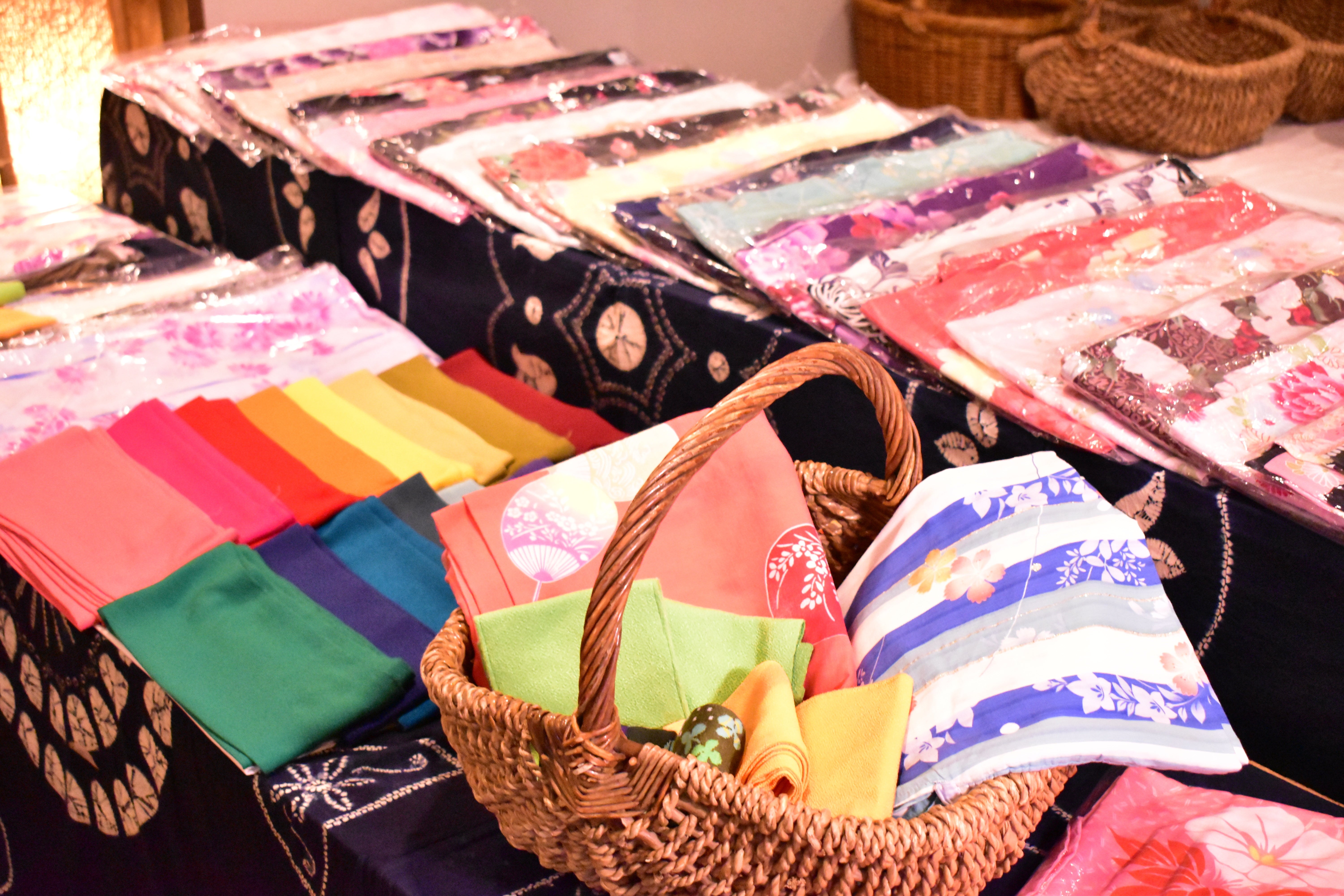 (スタッフ手づくりの選べる彩り浴衣の帯)