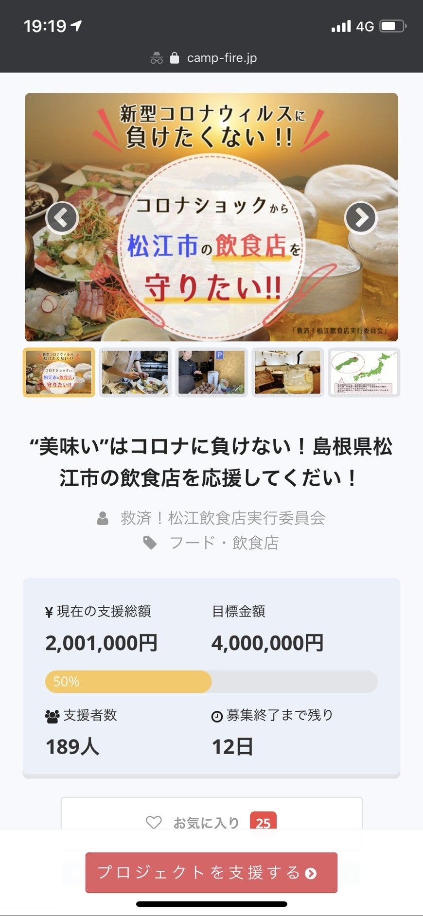 支援者様の方々に深く感謝いたします。残り日数12日目にして、支援金が200万円を超えました!!本当にありがとうございます。皆様のお声が励みなり元気を頂けます。そして何よりうれしいです!!目標金額まであと半分。最後まで走り続けます。目標金額に達した暁には、コロナが収束してから松江市の飲食店が集まり、食のイベントを開催したいと思っております。多くのご支援ありがとうございます。引き続き、松江の飲食店へのご支援宜しくお願い致します。↓ 松江飲食店救済実行委員会の応援サイト↓https://matsue-insyoku.com/