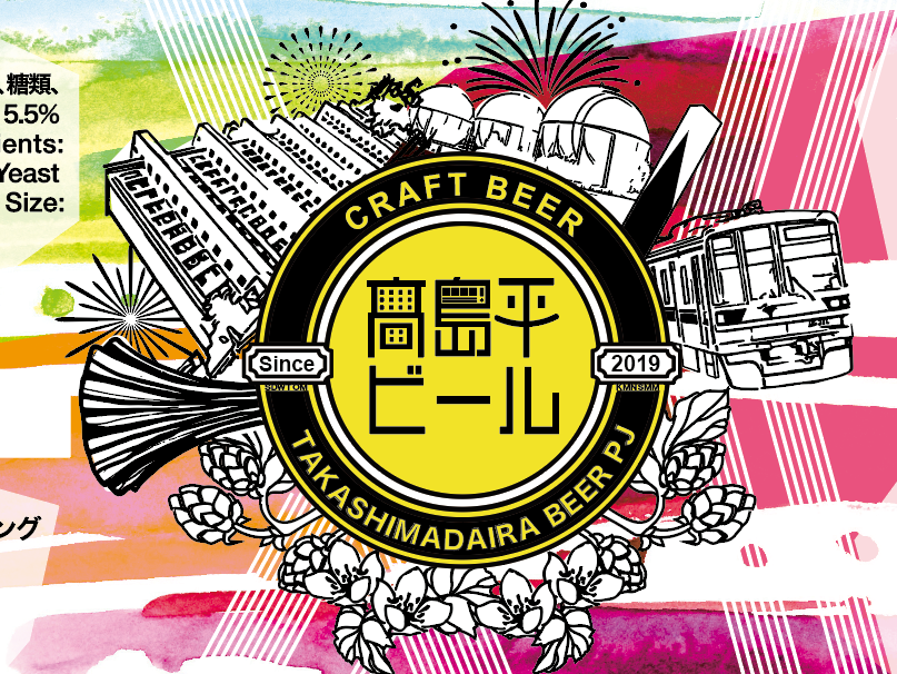 2019年秋、醸造所との連絡を取りながら、高島平在住のデザイナーMieさんを中心に、ロゴマークとラベルデザインを決めていきました。ロゴマークは4つの案からFacebookなどで人気投票を行い決まりました。ラベルはワクワク楽しい雰囲気のピンクと黄色を多く使ったデザインで、いたばし花火大会、高島平団地、三田線など、高島平の町にゆかりのあるモチーフを多く使いました。