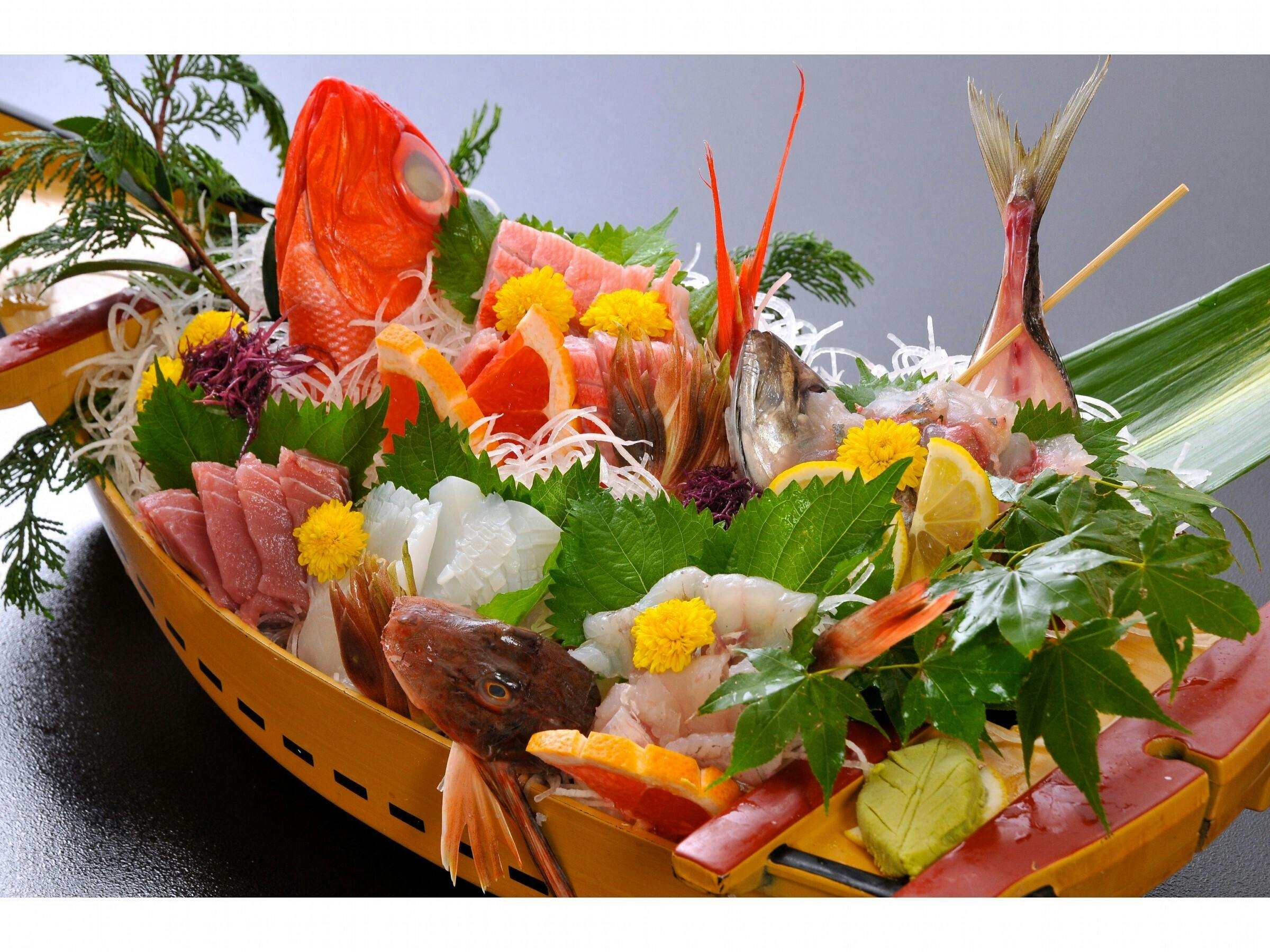 ご夕食は個室食事処で海の幸たっぷりのお食事を。