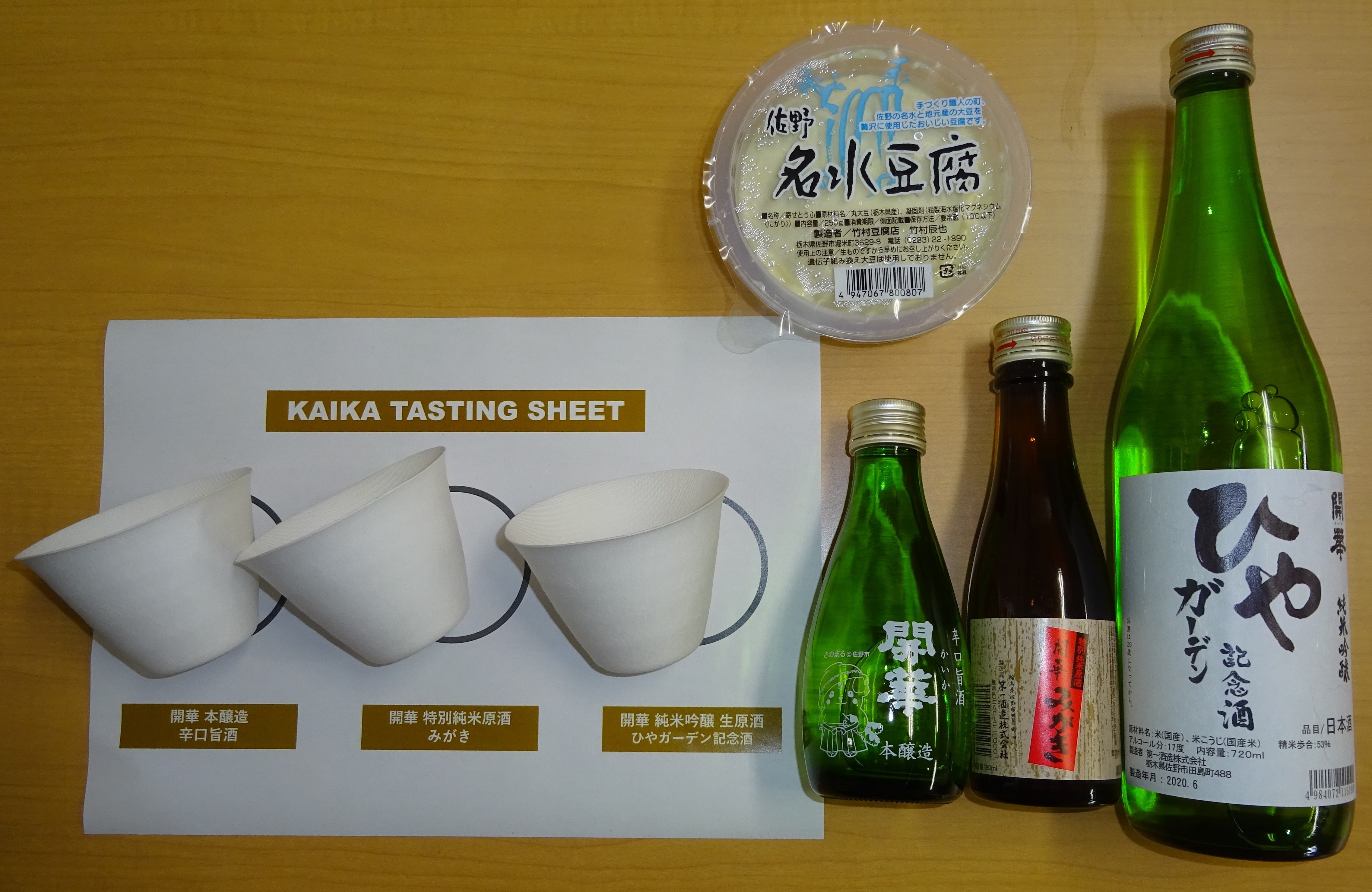 佐野名水豆腐を肴に、3 種類の日本酒が楽しめる「開華飲み比べキット」を詰め合わせた、家飲みが断然楽しくなるお得なセットです。