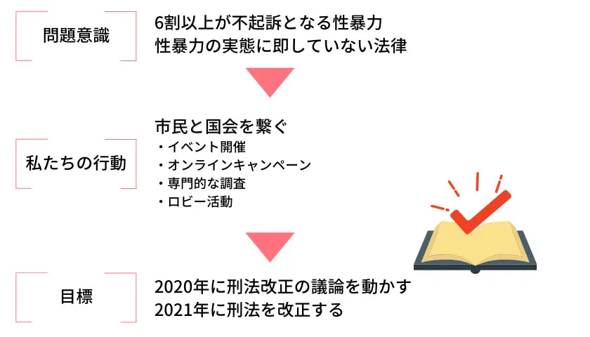 専門家の力をあわせ、世界の性犯罪規定を調査、日本より進んでいる国が、不同意性交罪を導入していることなど調査結果を発表、同意なき性行為を処罰するなどの刑法改正を求め、世界で起きていることを伝えてきました。