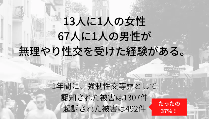 内閣府の調査によると、女性の13人に1人、男性の67人に1人が、「無理やり性交を受けた経験がある」と回答しています。しかし、実際に被害が認知された例は、1307件。起訴された被害はそのおよそ37%の492件となっています。性犯罪の起訴数は、他罪と比較しても低いのです。