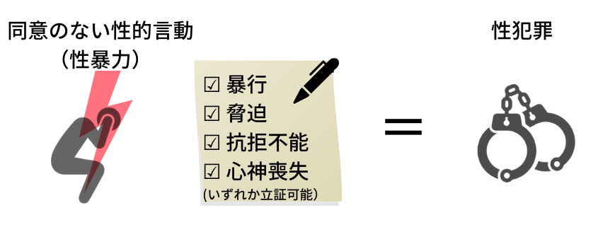 現在の法律では、同意のない性行為をされたことが明らかでも、「暴行」「脅迫」「抗拒不能」「心神喪失」などの要件を証明しない限り、加害者は罪に問われません。
