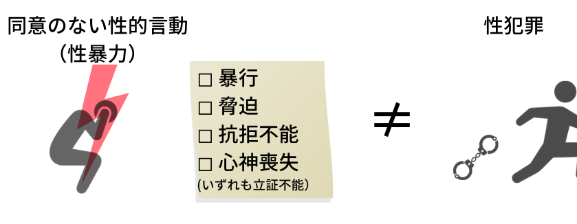 現在のレイプ罪成立には、同意なしに性行為が行われたことが明らかでも、「暴行」「脅迫」による性交等があったことを証明しない限り、加害者は罪に問われません。そのため、警察に届けても約6割が不起訴となるなど、未だに「性暴力」の被害にあっても泣き寝入りをせざるを得ない人が多くいるのです。