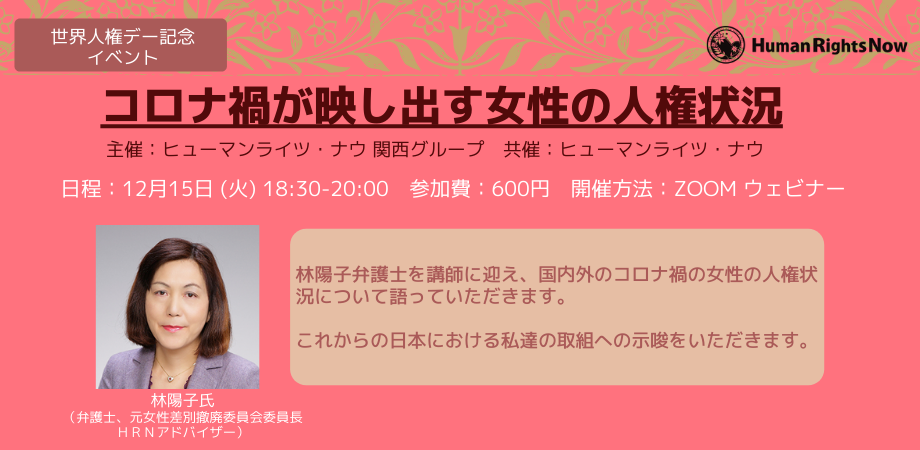 【世界人権デー記念イベント開催】12月15日18:30~「コロナ禍が映し出す女性の人権状況」