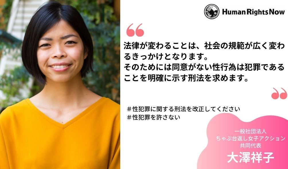 法律が変わることは、社会の規範が広く変わるきっかけとなります。そのためには同意がない性行為は犯罪であることを明確に示す刑法を求めます。