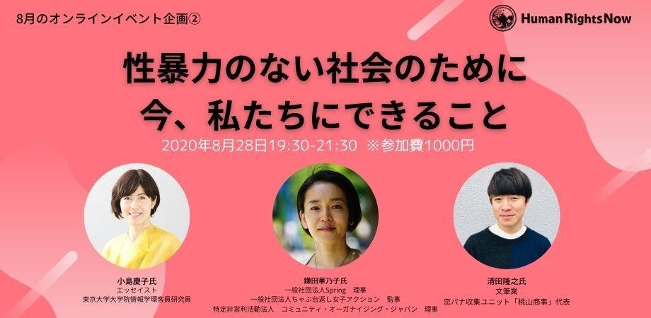 そこで、8月28日(金)、ヒューマンライツ・ナウは、ジェンダー平等実現のために様々な立場から活動されている小島慶子氏、鎌田華乃子氏、清田隆之氏をお呼びし、性暴力を構造的に捉え、個人にできるアクションを考えるイベントを開催します。