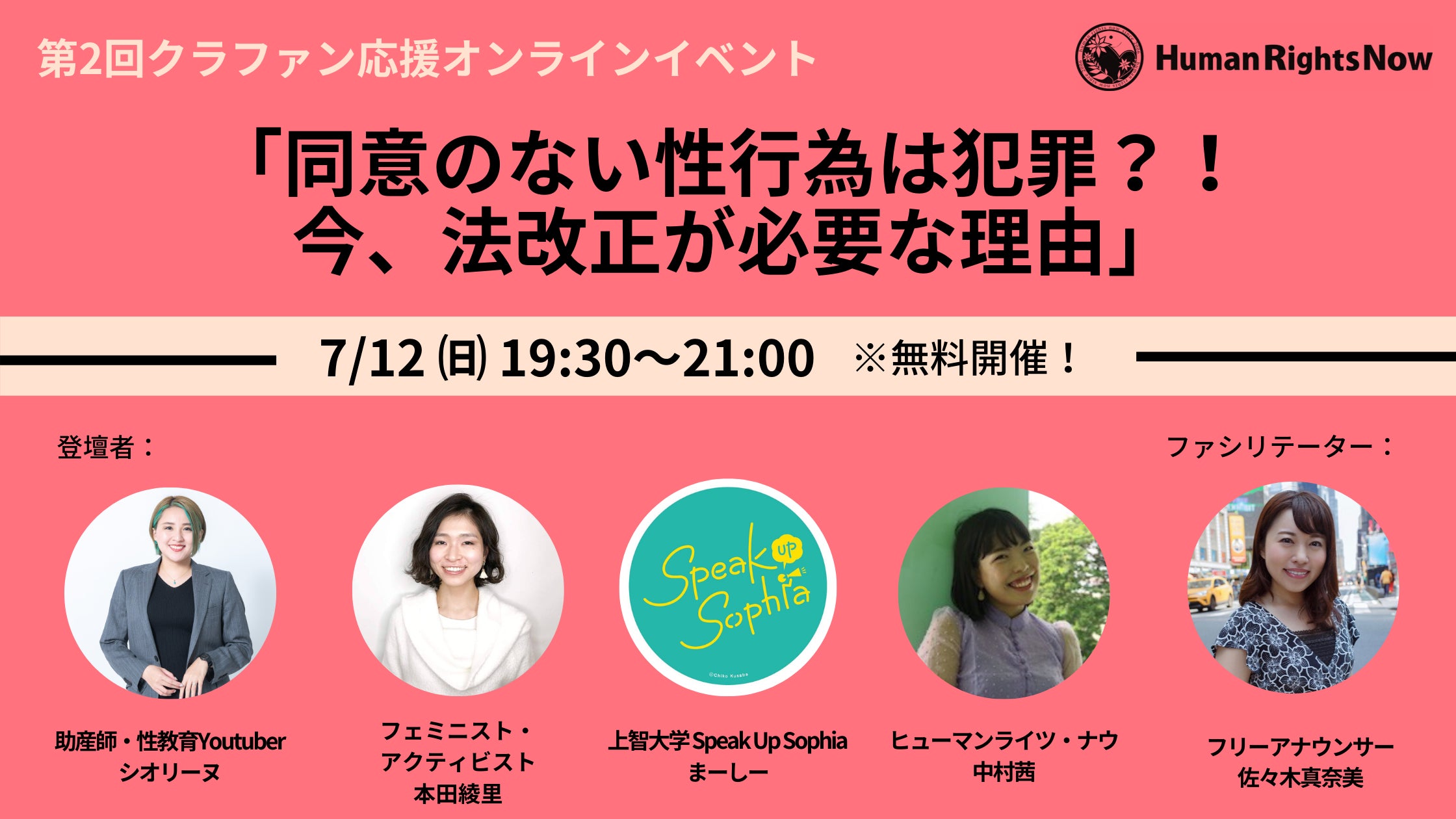 〜〜 申し込み多数につき、参加者枠を増枠しました。(締め切り:7月11日15時)〜〜みなさま6月8日から開始したクラウドファンディングは、皆様のご支援に支えられ、70%超を達成しました。ありがとうございます!刑法改正キャンペーンをより多くの方に知っていただき、クラウドファンディングも盛り上げていくために、7月12日㈰、クラファン応援イベント第二弾を開催することとなりました。2017年の大幅な刑法改正から積み残された課題の一つである「暴行・脅迫要件の撤廃」。2020年の法改正では、これを実現して「同意のない性行為は性犯罪である」という法律を明確にすることを求めています。今回のイベントは助産師・性教育Youtuberのシオリーヌさん、フェミニスト・アクティビストの本田綾里さん、上智大学Speak Up Sophiaのまーしーさん、をゲストに迎えて、性的同意や性教育の観点から法改正の必要性について考えます。イベントへのお申込み方法は下記の詳細をご覧ください。※ できるだけ、クラウドファンデイングにご寄付いただいたうえでご参加いただけると嬉しいです。※ 刑法改正キャンペーンとクラウドファンディングを応援してくれる方、応援することに興味がある方のみご参加ください。登壇者への批判を目的としたご参加はご遠慮ください。皆様のご参加をお待ちしております!****************************************「〜クラファン応援〜同意のない性行為は犯罪?! 今、法改正が必要な理由」【開催日時・実施方法】7月12日(日) 19:30〜21:00、Zoom【登壇者】・助産師・性教育Youtuber:シオリーヌ(大貫 詩織)氏・フェミニスト・アクティビスト:本田綾里氏・上智大学Speak Up Sophia:まーしー氏・HRNスタッフ: 中村茜【ファシリテーター】・フリーアナウンサー/HRNプロジェクトサポーター:佐々木真奈美【参加費】無料【参加申込み】・下記会見申込フォームにて7月11日午後3時までにお申し込みください。https://forms.gle/1bT24HF4TiLrAVLq7・イベント当日朝までに,ZOOM会議のIDとパスワードをご連絡致します。 【登壇者プロフィール】・シオリーヌ(大貫 詩織)(助産師/性教育YouTuber)総合病院産婦人科にて勤務ののち、現在は学校での性教育に関する講演や性の知識を学べるイベントの講師を務める。性を学ぶオンラインサロン「yottoko labo」オーナー。YouTuberとして性を学べる動画を配信中! ・本田綾里(フェミニスト・アクティビスト)大学卒業後、ロンドン・スクール・オブ・エコノミクスでジェンダー学修士号を取得。「これからフェミニズムを学びたい人へ」をテーマに、イベントやSNSを通じて発信。 ・まーしー(上智大学 Speak Up Sophia)性的同意を上智大学で広めること、を目的に活動。性的同意について考えるワークショップの開催やイベントの登壇、SNSを通じた発信中。 ・中村茜(HRNスタッフ)世界と日本で今も続く深刻な人権侵害をなくすために活動する、日本を本拠とする国際人権HRNのスタッフ。女性の権利プロジェクトでイベント・キャンペーン担当。 ・佐々木真奈美(フリーアナウンサー・HRNプロジェクトサポーター)2010年、テレビ朝日系列局にアナウンサーとして入社。夕方ニュース番組キャスターなどを担当。2013年よりTBS NEWSキャスターに就任。2016年からは渡米し、現地の大学でジャーナリズム留学。その後、アメリカのニューヨークにてマーケット情報などを伝えるアナウンサーとして活動。 【問い合わせ先】認定NPO法人 ヒューマンライツ・ナウ 事務局(担当:中村)電話:03-6228-1528 Mail: akane.nakamura@hrn.or.jp