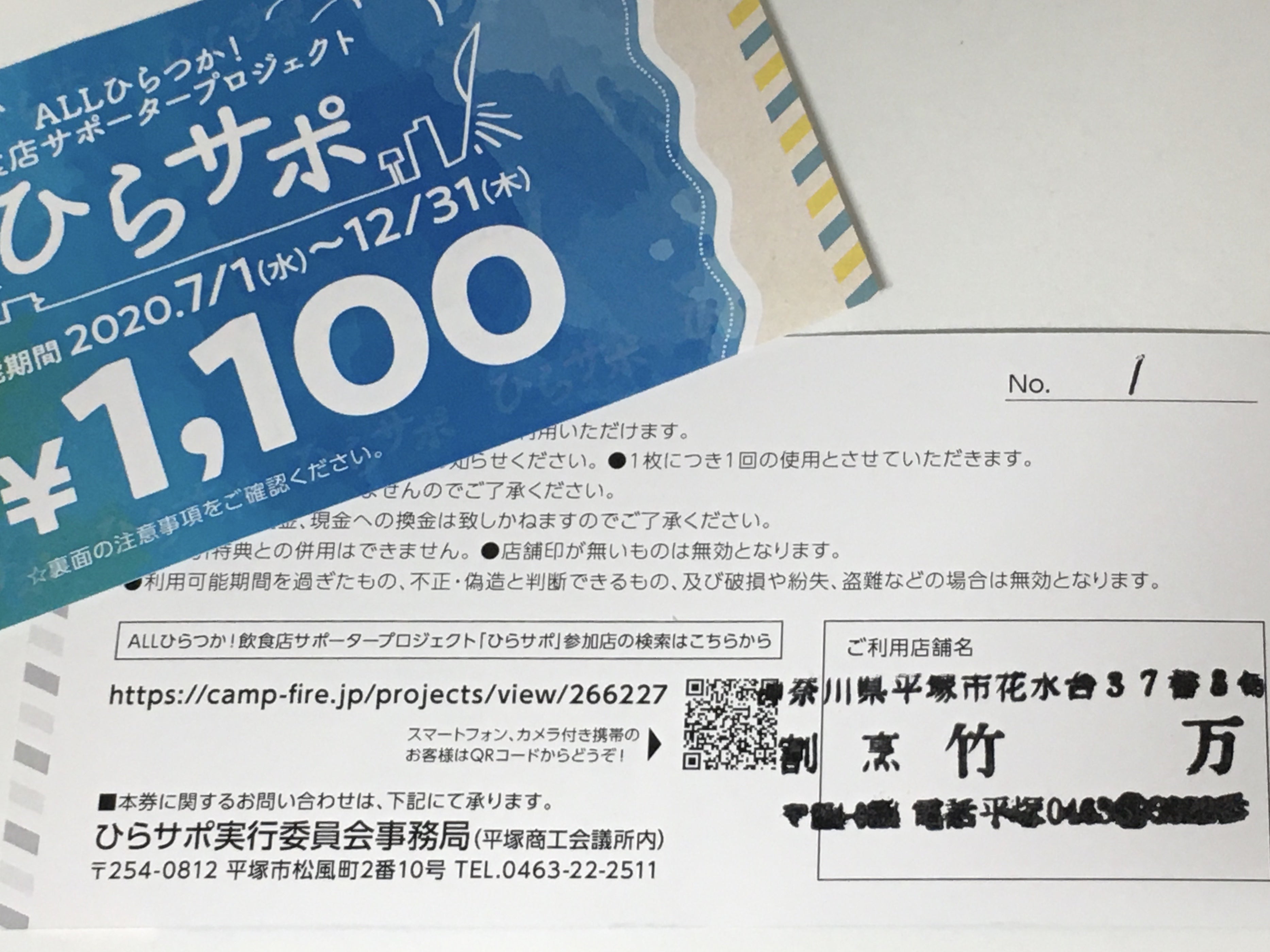 2020/06/10 10:53ひらサポのクラウドファンディングが締め切られ、ご支援いただいた方の情報精査にかなりの時間を費やしていたため、今後の予定のお知らせが遅くなりました。失礼しました‥食事券がお手元に届くまで下記のようなスケジュールになっています。・6月10日から12日までひらサポ参加店に対して、平塚商工会議所での食事券と支援者情報の配布・6月20日までひらサポ参加店から支援者への食事券の郵送もしくは店頭での引き渡し7月1日から12月31日食事券使用期間以上になります。ご自分が支援したお店に食事券の郵送を希望したのか、店頭引き渡しを希望したのか、各自でご確認をお願いします。また、郵送を希望され、20日を過ぎても食事券がお手元に届かないという方がいた場合、下記の2つの可能性があります。①参加店が食事券の郵送をしていない、もしくは店頭引き渡しのつもりでいる。②備考欄の参加店・口数・受け取り方法の記載の確認が取れていない。備考欄の不明の方に、実行委員会から直接連絡をして確認していましたが、連絡がつかなかった方になります。どちらの場合も、まずはご自分が希望された参加店に直接ご連絡をお願いします。①の場合、参加店に対応を依頼してください。②の場合、参加店が入手している支援者情報にお客様の記載がないので、お手数ですが平塚商工会議所までご連絡をお願いします。何卒、もうしばらく食事券がお手元に届くまでお待ちください。 もっと見る