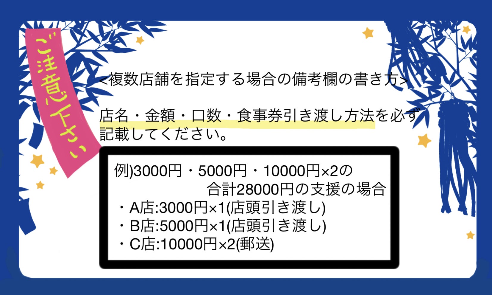③備考欄に必ず参加店名と食事券引き渡し方法(店頭or郵送)をご記入ください。
