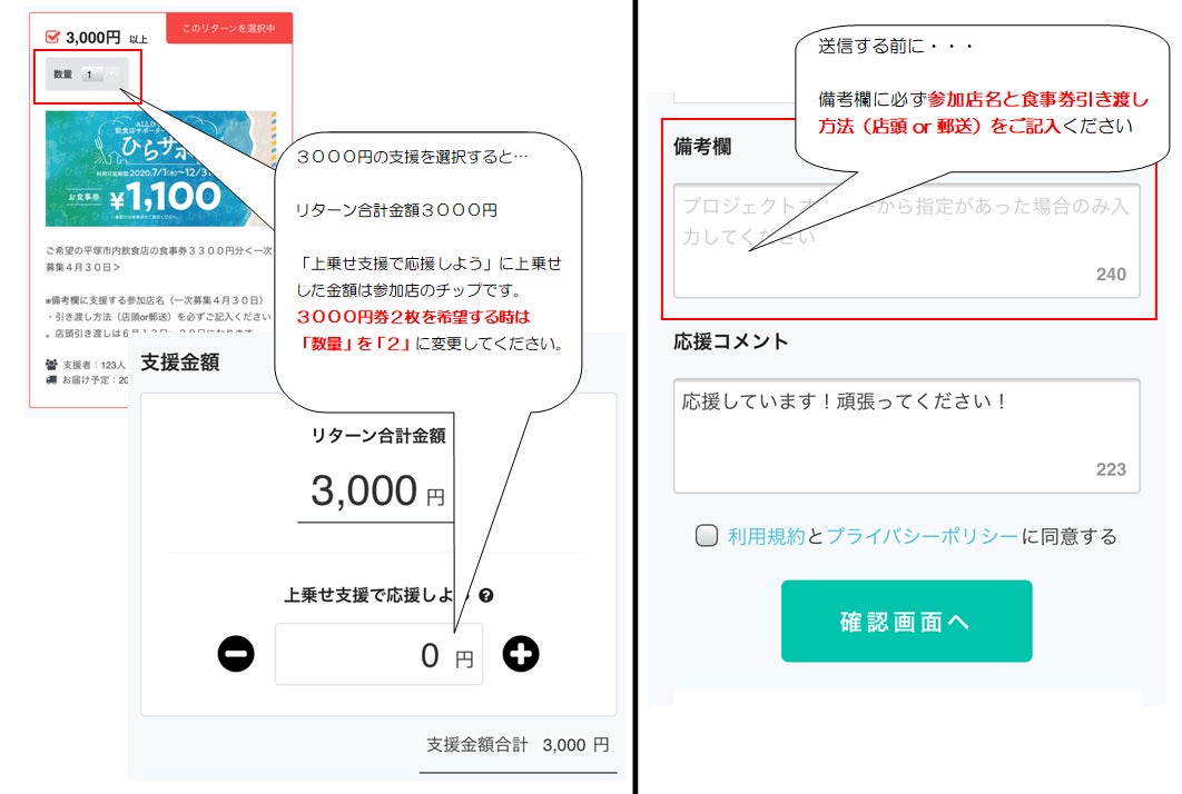 例)上乗せして支援金額合計4000円:3300円食事券のリターンのみで、1000円は参加店のチップになります。