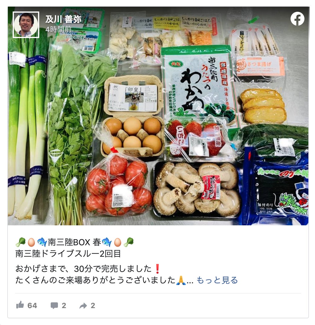 実は現在、町の生産者と商工会青年部の仲間たちと「南三陸ドライブスルー」という取組を行っています。イベントや営業も思うようにできない今、町内の若手生産者・事業者がタッグを組み、南三陸の産品をドライブスルーで販売しようという企画です。