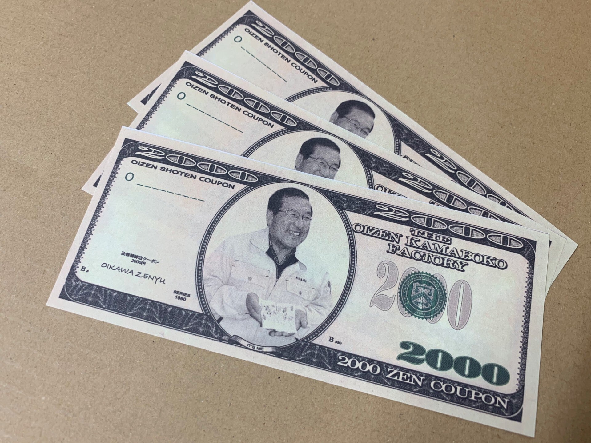 そう!弊社社長、及川善祐の顔をあしらったこちらが、今回リターン品としてお届けする商品券2000円分でございます!!