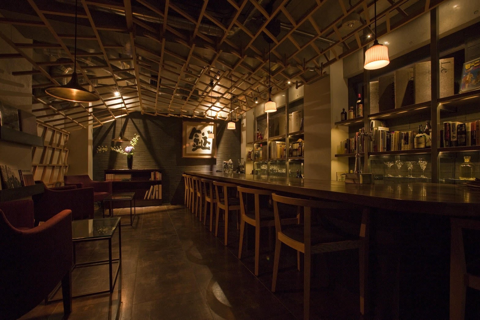 店舗紹介:ウッディな内装の店内は、照明が落とされ落ち着きのある雰囲気。