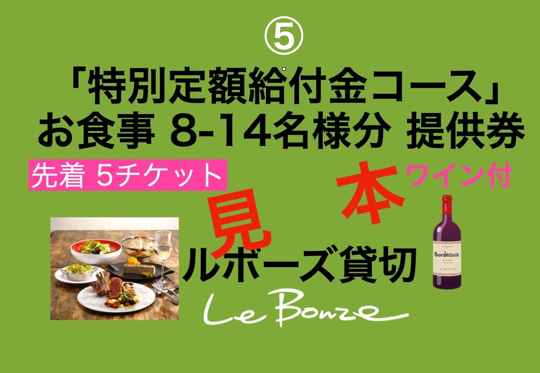 ⑤「特別定額給付金コース(8-14名様分/ワイン付)」100,000円(先着5チケット)