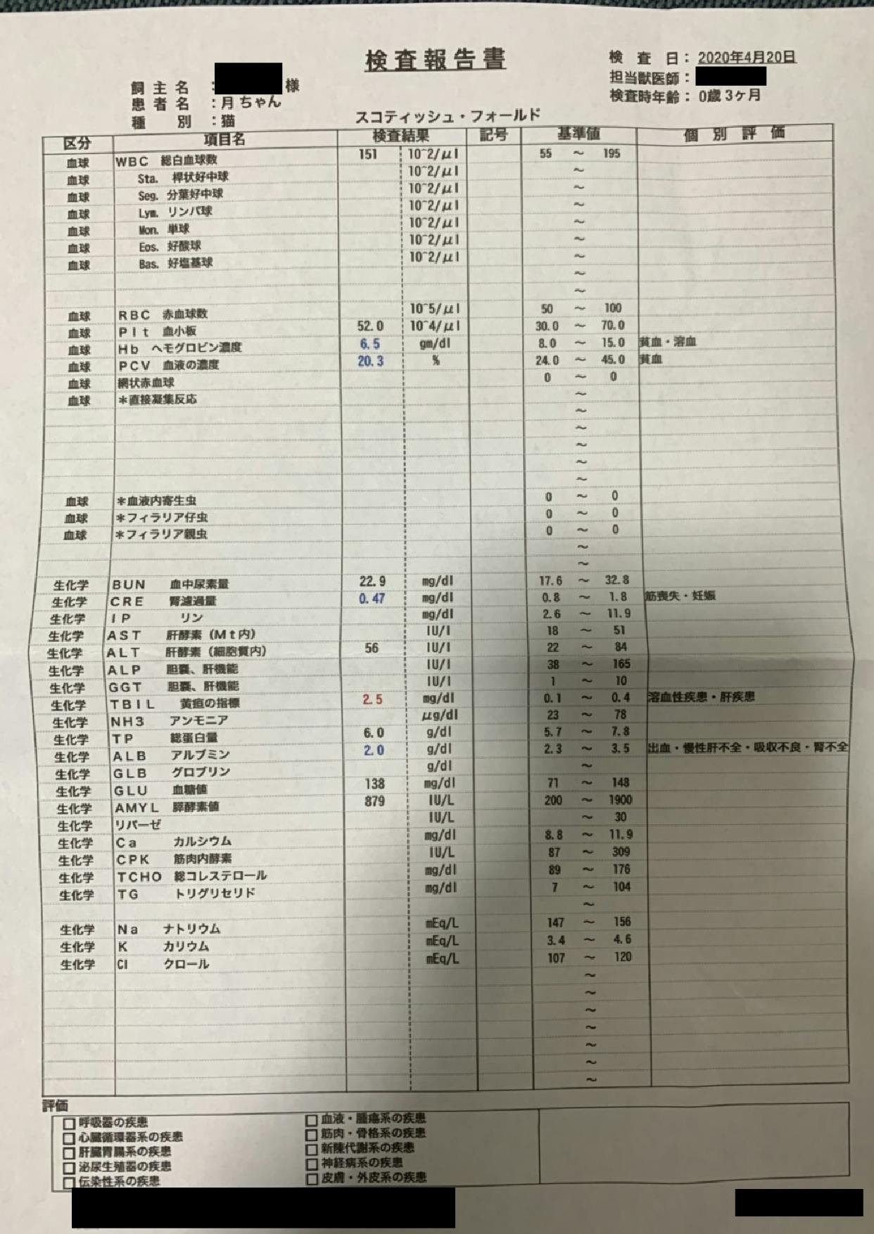 ですが、食事の量が減り、お腹が少し膨らんでいるように見えるなど月の様子がいつもと違う為、4月20日に病院に連れて行き検査をしたところ、お家に迎え入れてたった3週間という短い期間で、月はFIP(猫伝染性腹膜炎)という致死率100%とも言われる難病にかかっていることが発覚いたしました。まだ生後3ヶ月です。