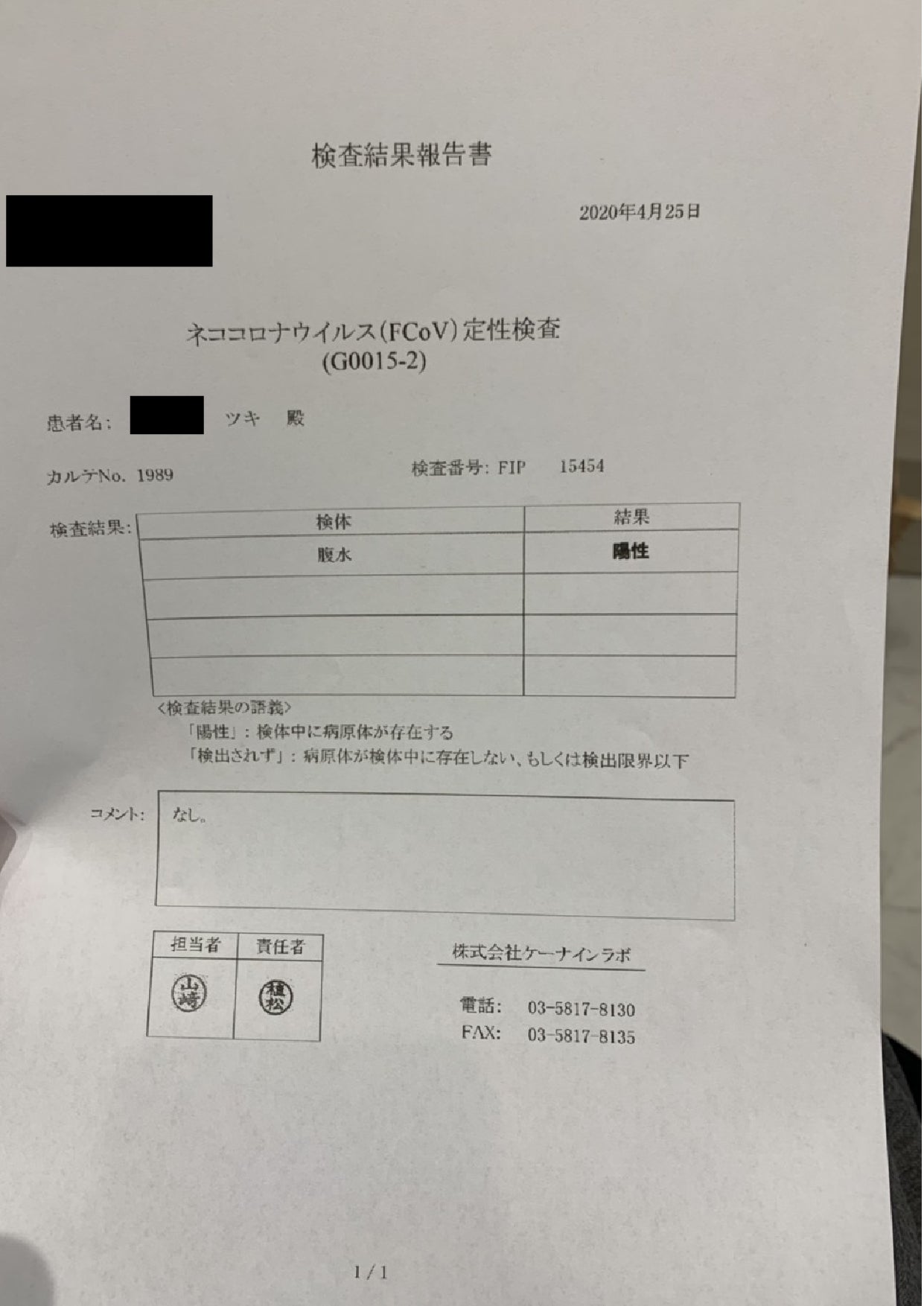 4月20日に検査し、4月25日に陽性の検査結果が出てすぐにその日から投薬を開始いたしました。