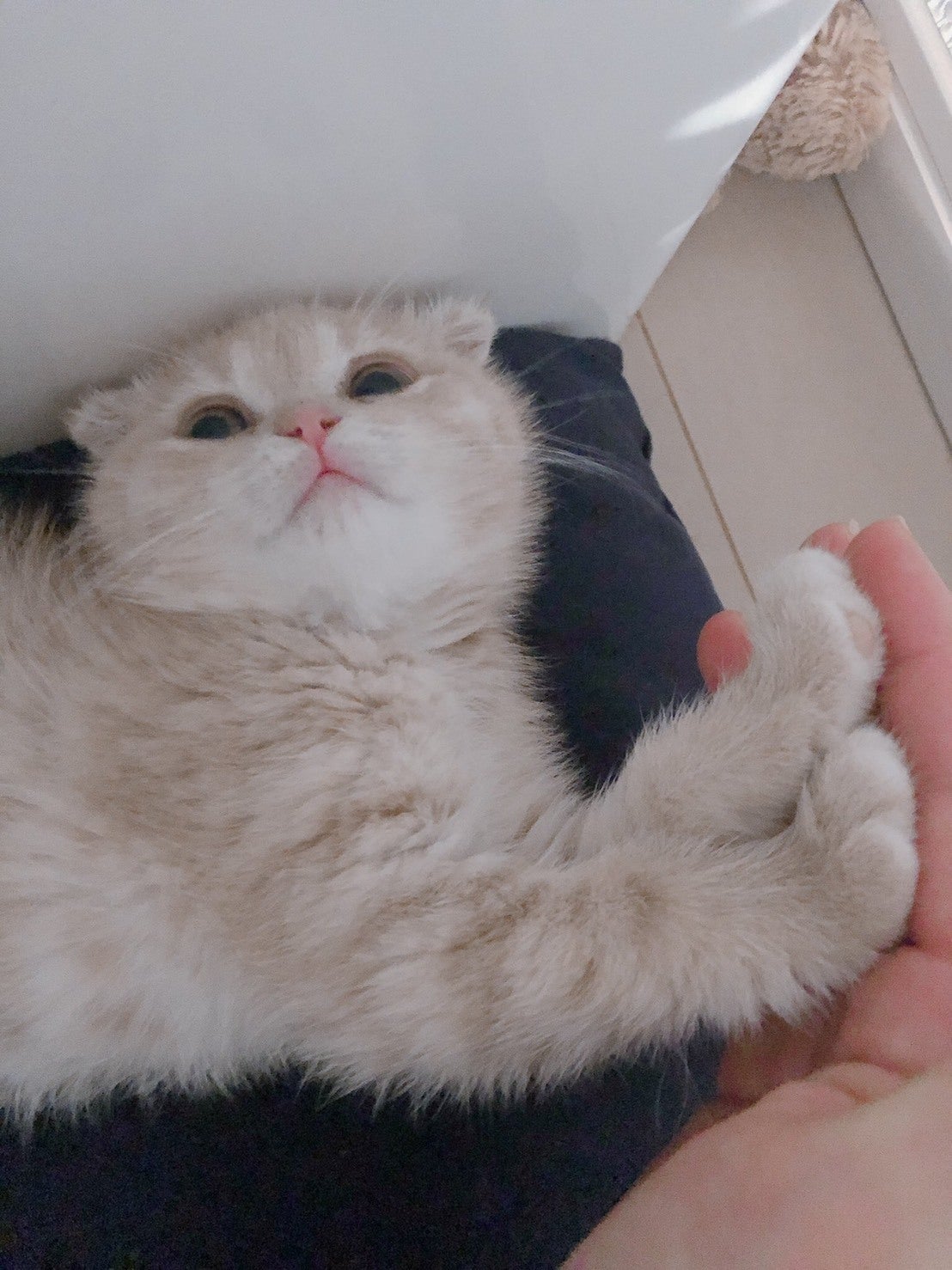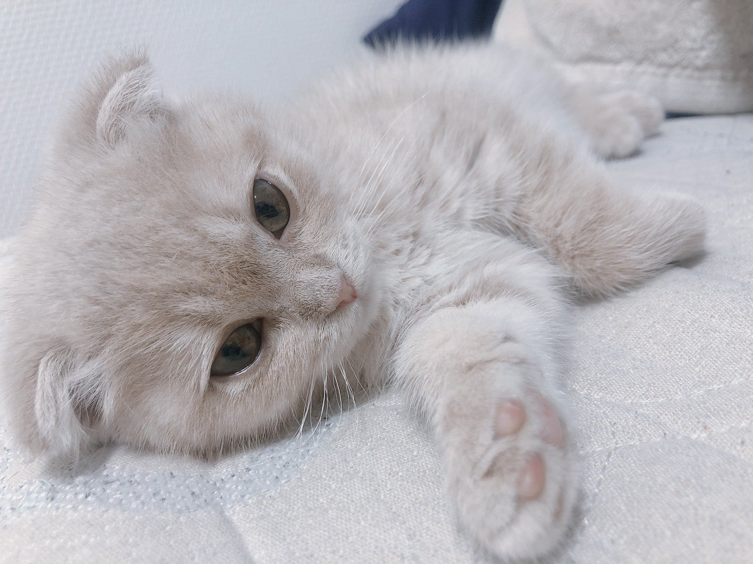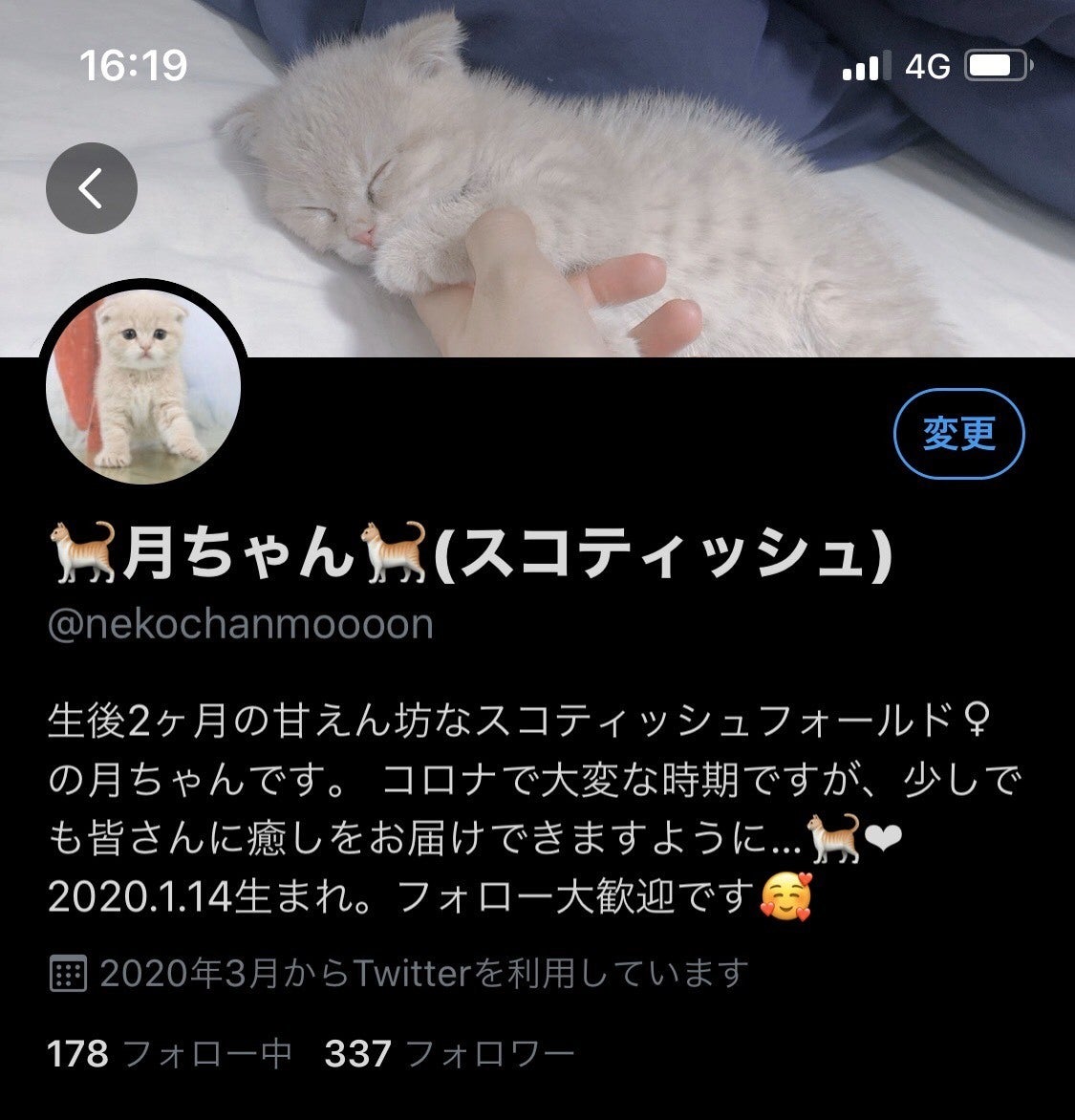 2020年1月14日生まれのスコティッシュフォールド、名前は月ちゃんです。来てからすぐに慣れてくれて、寝る時も一緒にくっついてくれたりと幸せな生活が始まりました。