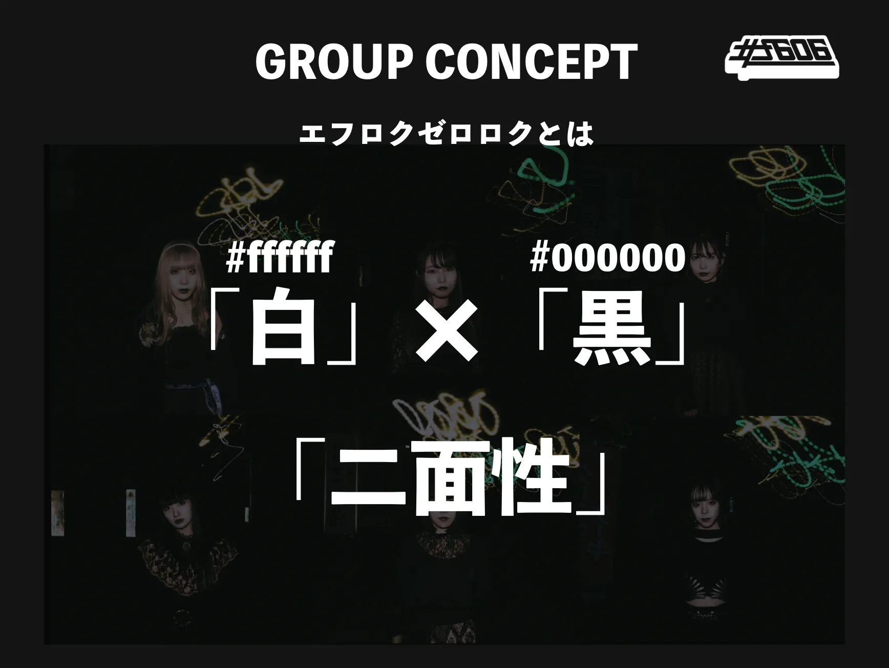 私たち#f606は「白」と「黒」の「二面性」をコンセプトに活動するアイドルグループです。読み方は「エフロクゼロロク」(通称エフロク)でカラーコードの 「白(#ffffff)」と「黒(#000000)」を組み合わせて「白黒」という意味を持ちます。