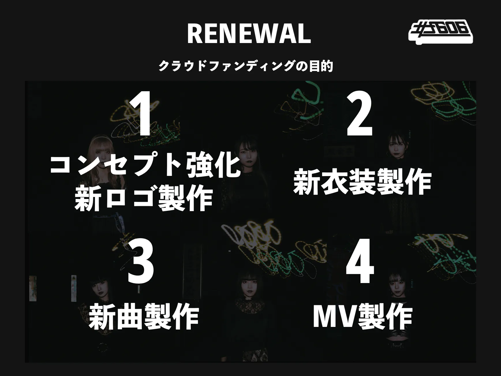 本プロジェクトを通して実現したい事は、第一目標の「100万円」という目標金額を達成し、「コンセプト強化/ロゴ刷新」「新衣装製作」「新曲製作」「MV製作」といったコンテンツを作る為の資金に活用させて頂きたいです。