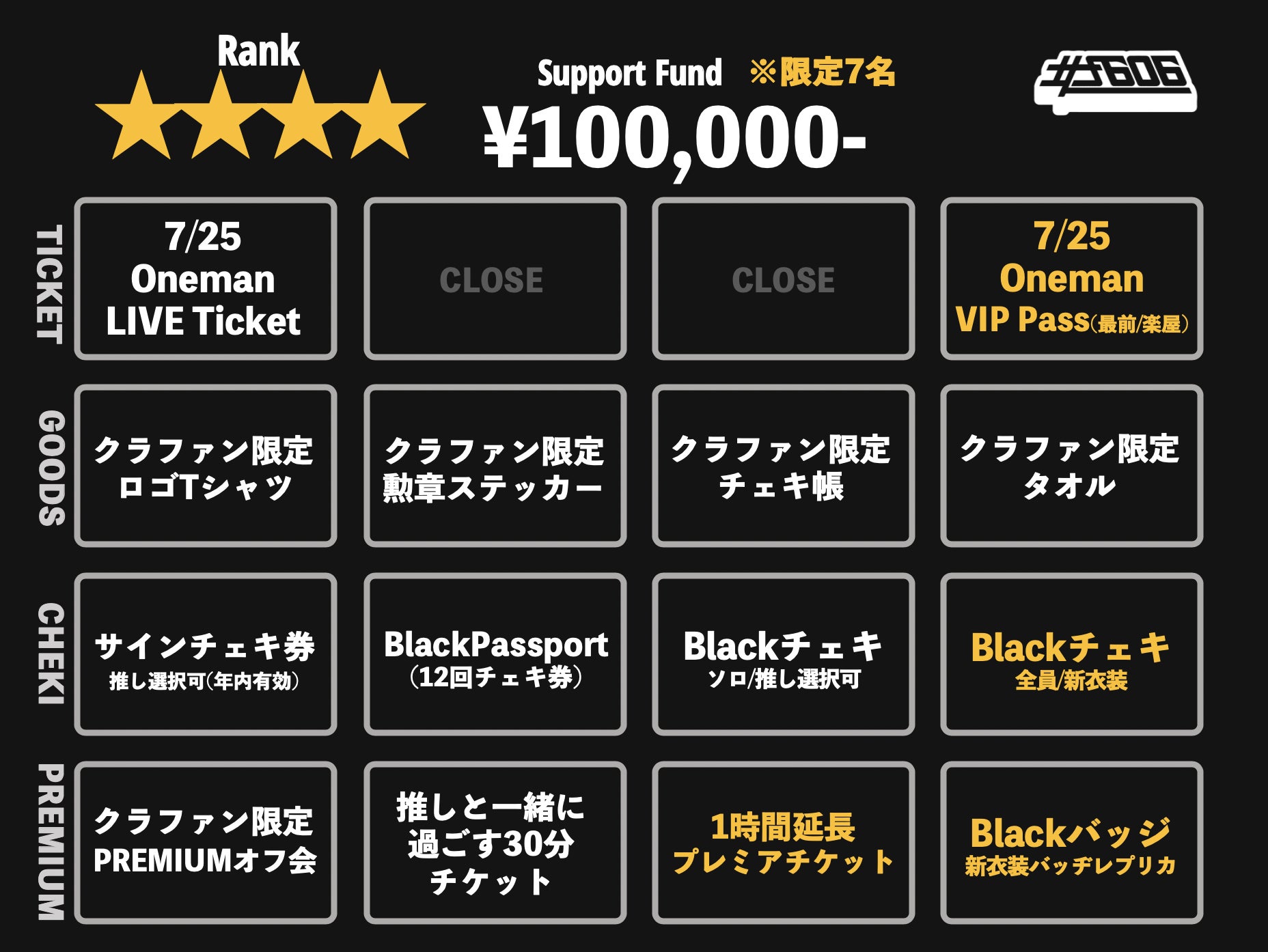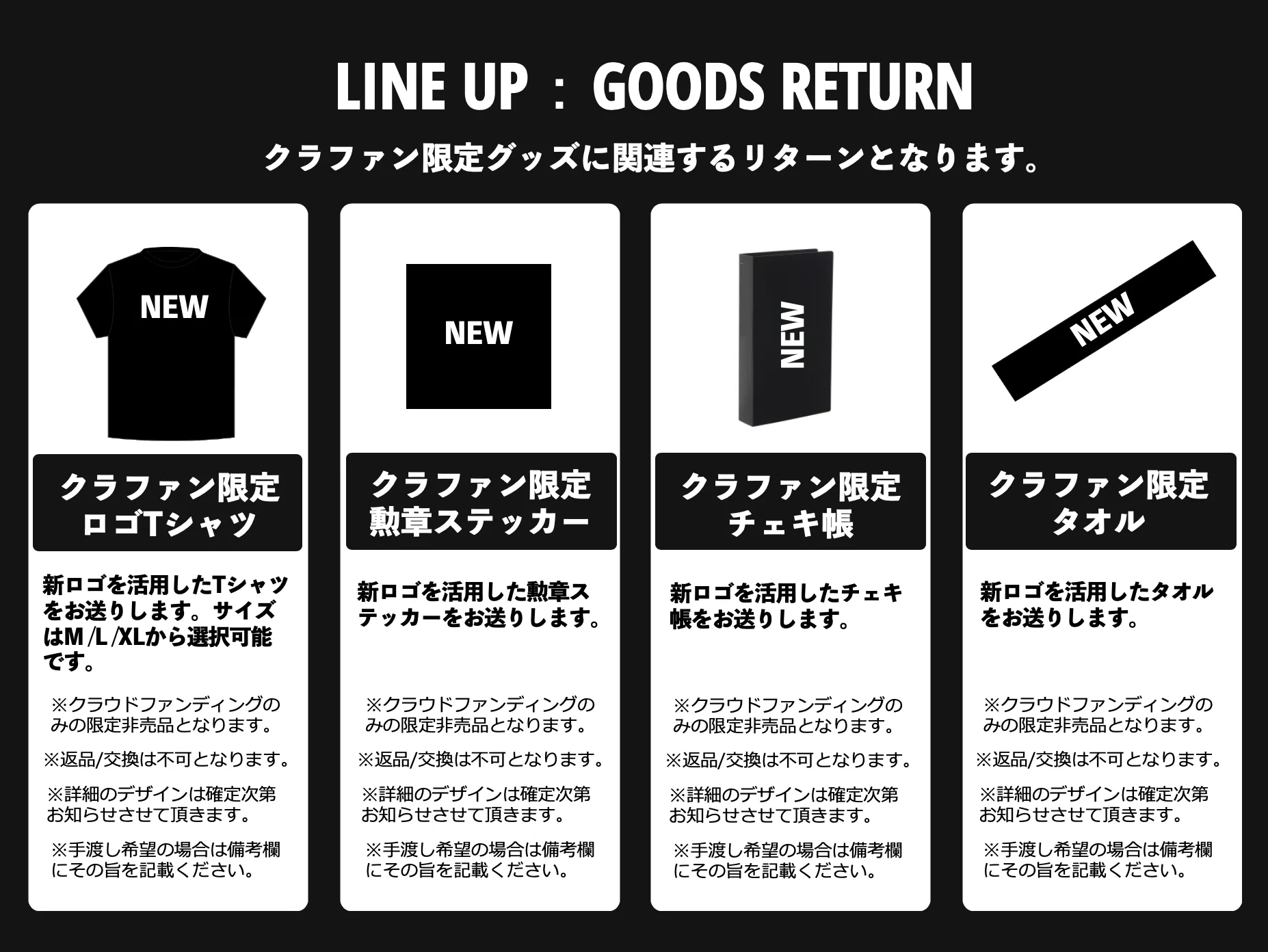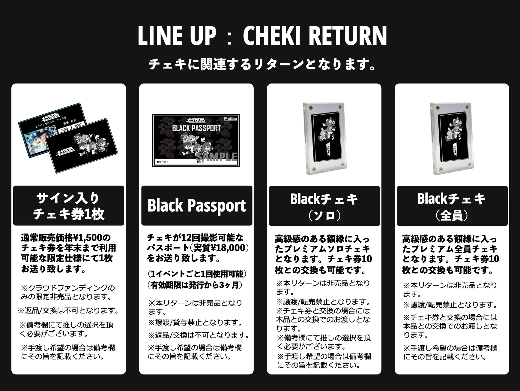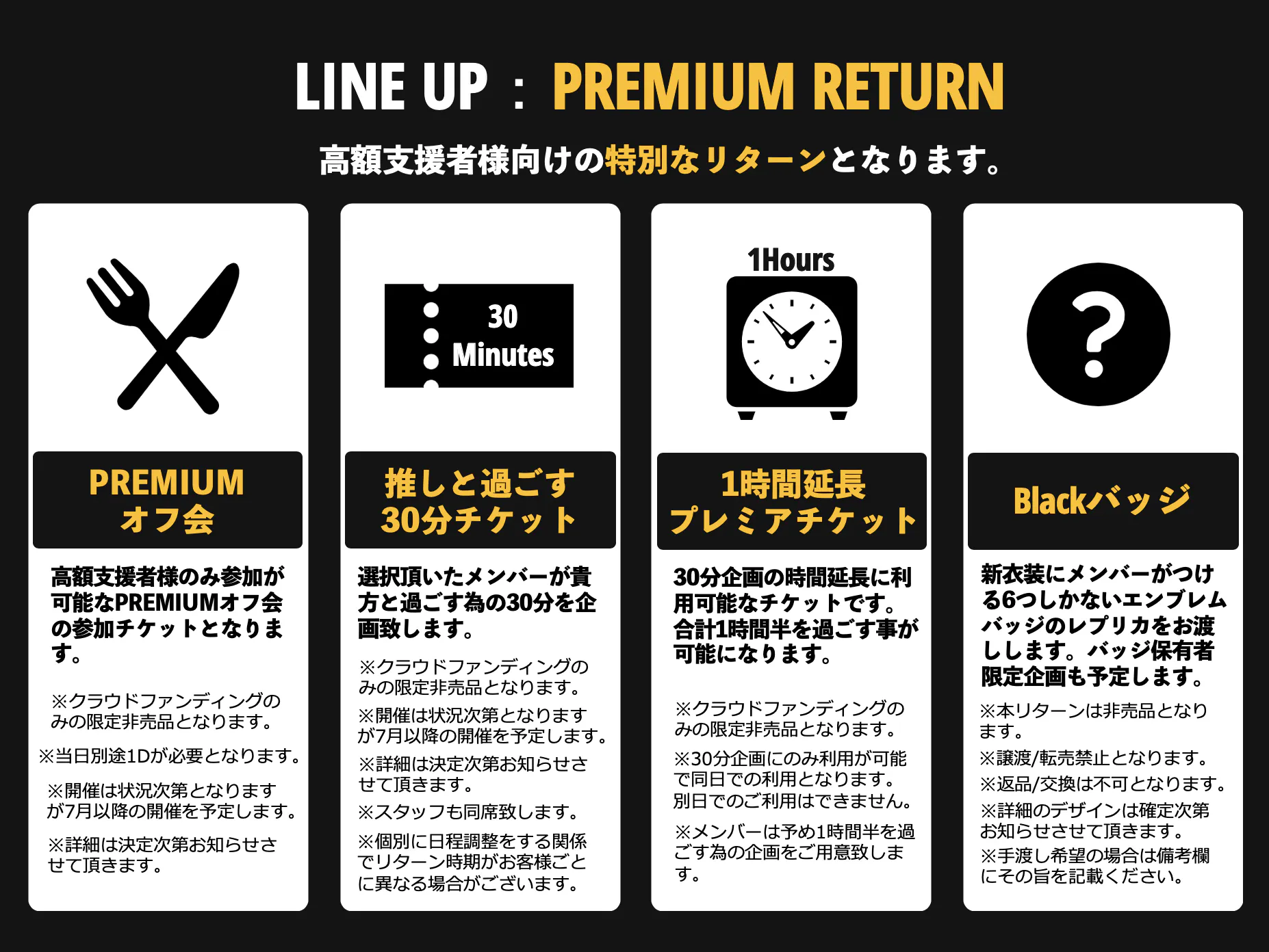 本クラウドファンディングでのリターンは大きく4種に分類され「Onemanチケット」「限定グッズ」「チェキ」「プレミアムリターン」となります。詳細は下記画像をご参照ください。