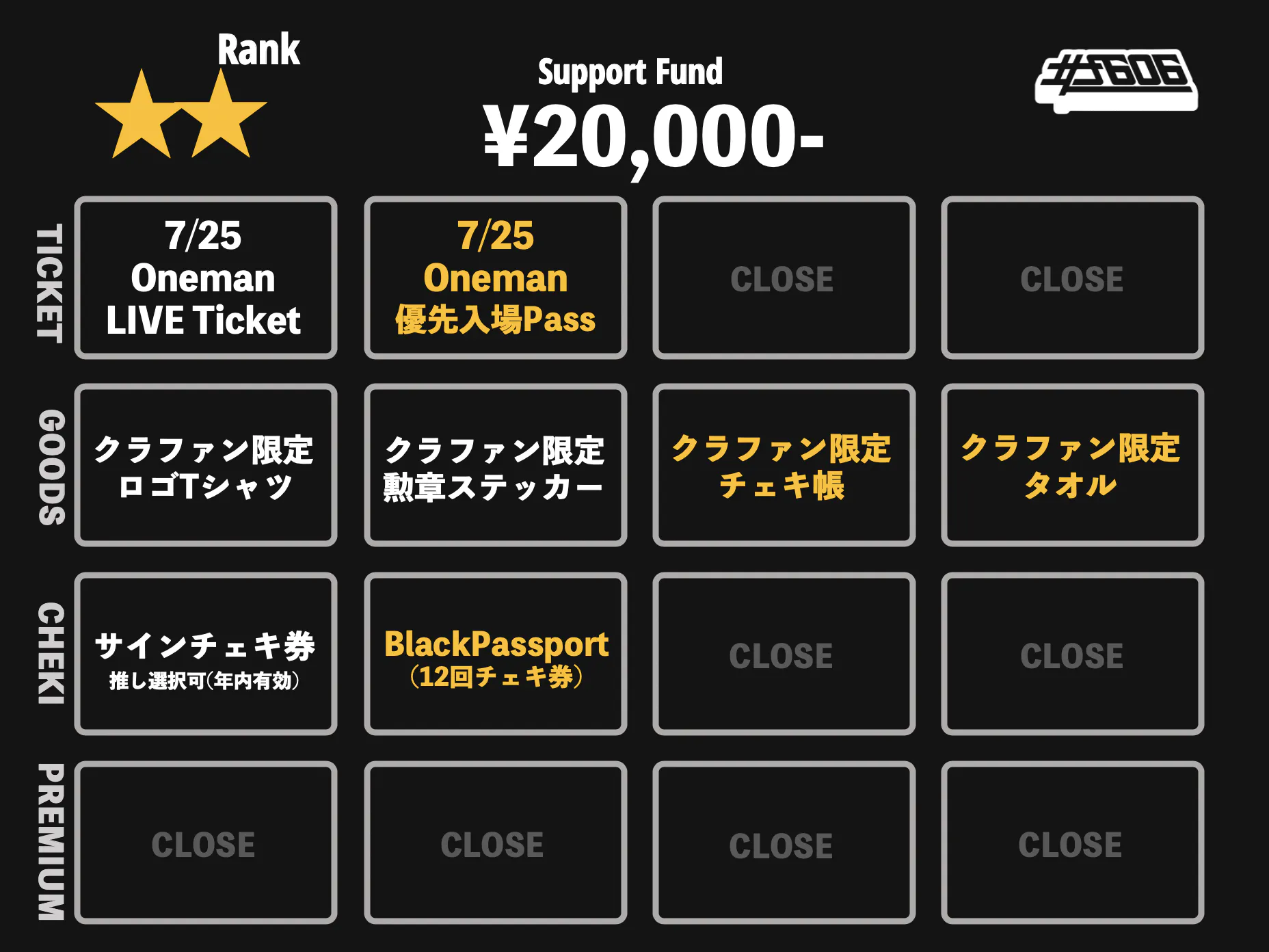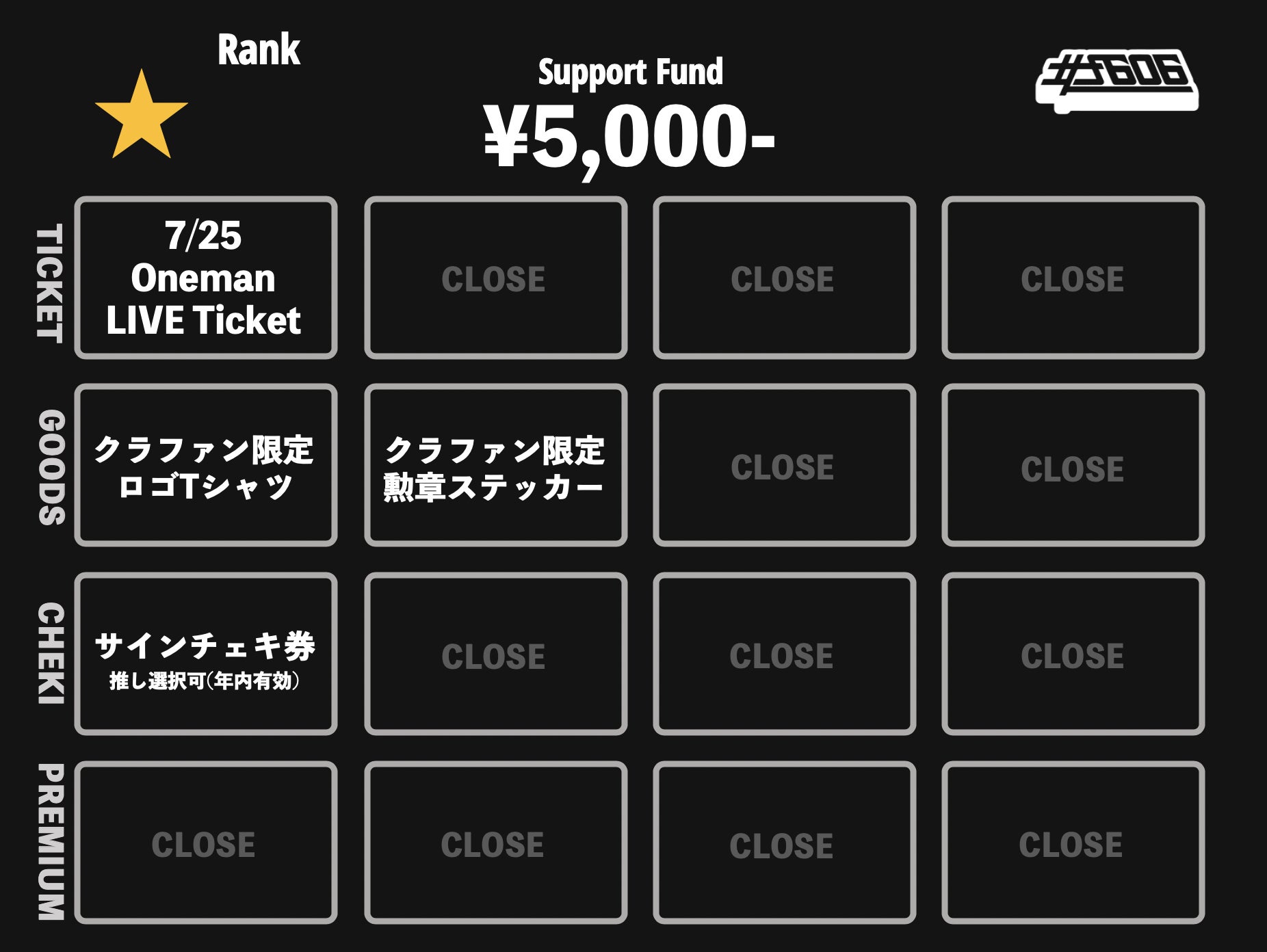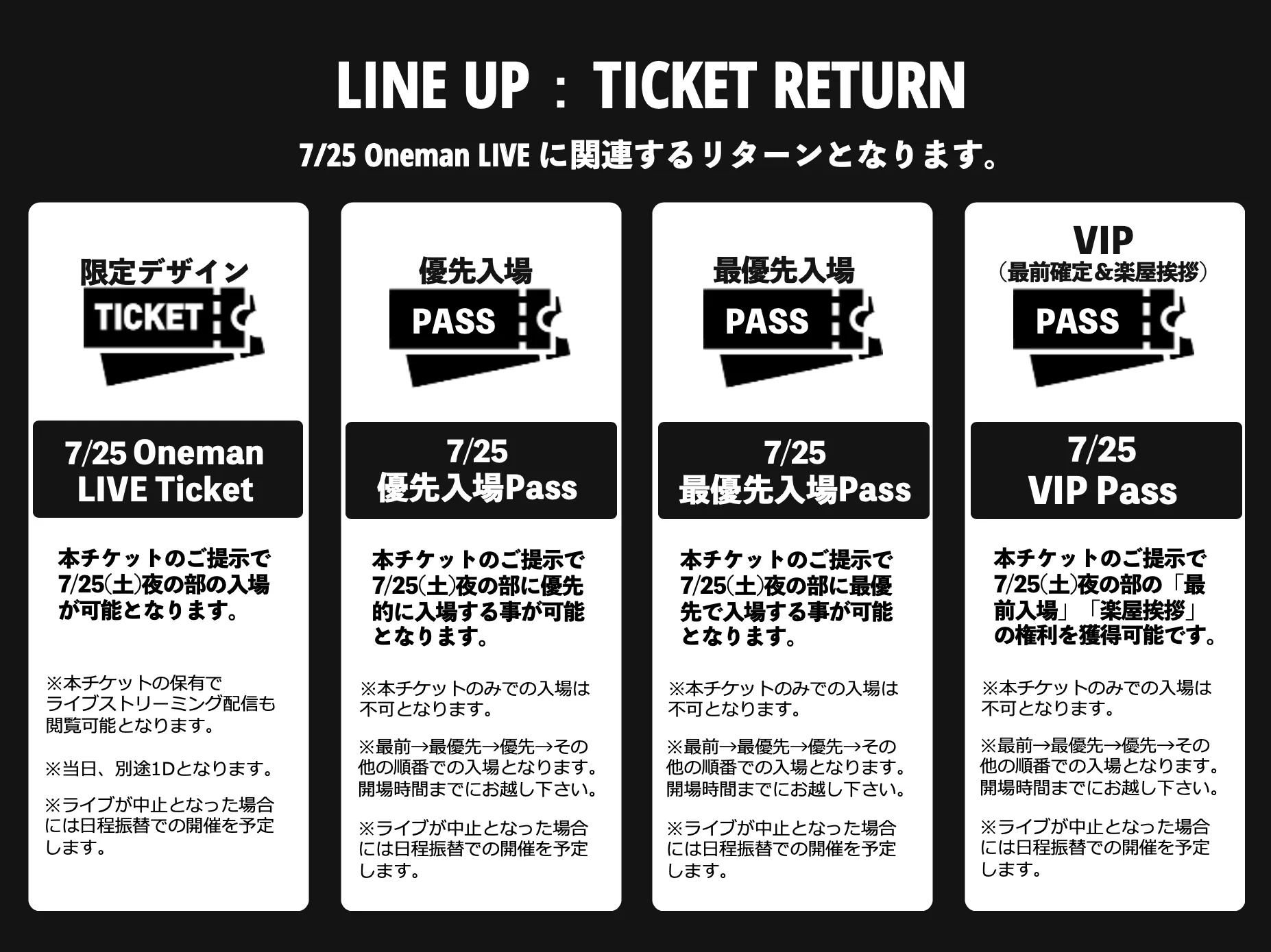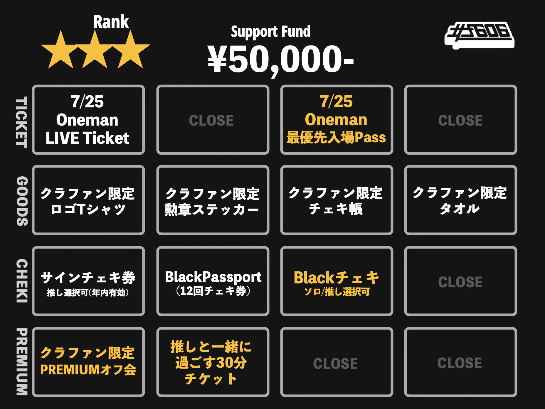 本クラウドファンディングでのリターンは大きく4種に分類され「Onemanチケット」「限定グッズ」「チェキ」「プレミアムリターン」となります。詳細は下記画像をご参照ください。
