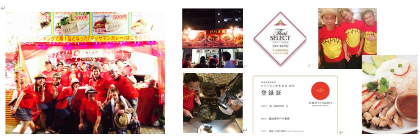 また、タイ大使館公認の「タイセレクト」の認定も受け、今までタイフェスティバルへ8年連続出店、激辛フェスティバル(東京・名古屋・広島)、パクチーパラダイス(東京)等 様々な大型食フェスへ参加する事や、キッチンカーでの出店、レシピ本「ガパオ食堂のマル秘レシピ」の出版、「八幡屋礒五郎 とのコラボレーション唐辛子」の発売、「ともコーラと共同開発したオリジナルクラフトコーラ」の販売、「フードシェアリングサービスアプリTABETEを活用した」食品ロス削減対策活動、「“6月8日はガパオの日”の認定」をとりつけるなど、レストラン営業だけで無く様々な切り口でタイ料理の味や知名度を広める事に尽力してまいりました。