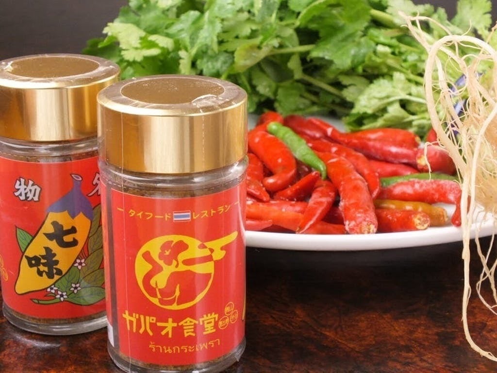 ガパオ食堂様とは2017年からのお付き合いで、専用の七味唐からしを開発させて頂いております。ガパオ食堂七味は、弊社店舗におきましても、七味唐からし×タイ料理という異色のコラボにご購入していかれるお客様も多い人気の七味です。