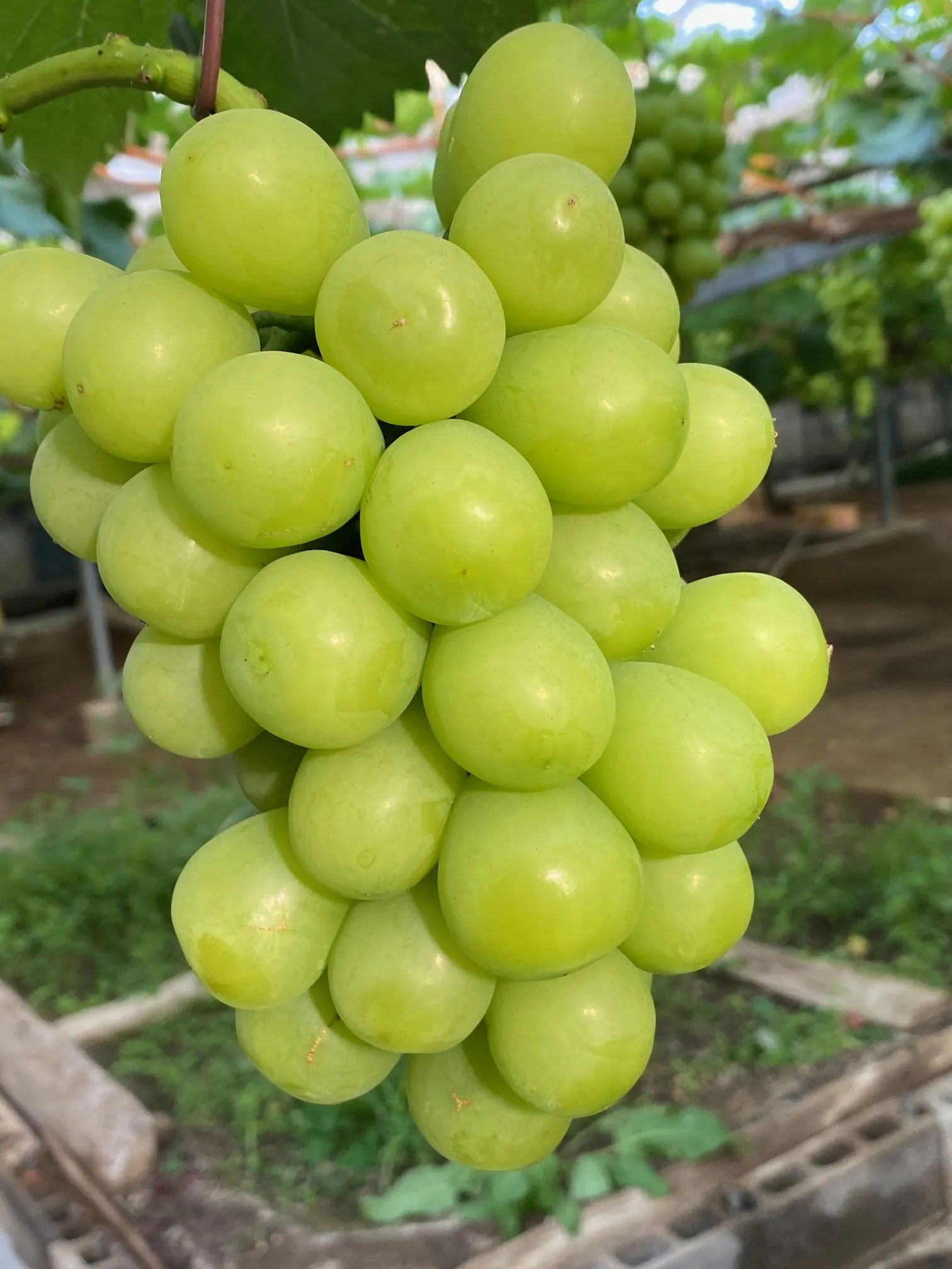 「マスカット・オブ・アレキサンドリア」に、病気に強い品種を掛け合わせ、さらにさわやかな香りの品種を掛け合わせて日本で生まれた種なしの品種です。粒はやや楕円形で黄緑色の形をしており、パリッとした食感の皮ごと食べられる手軽さと強い甘さで人気が高いです。雨に非常に弱く、苗木を植えて実がなるまで3年はかかるため、当園でも、わが子のように手塩にかけて育てています。
