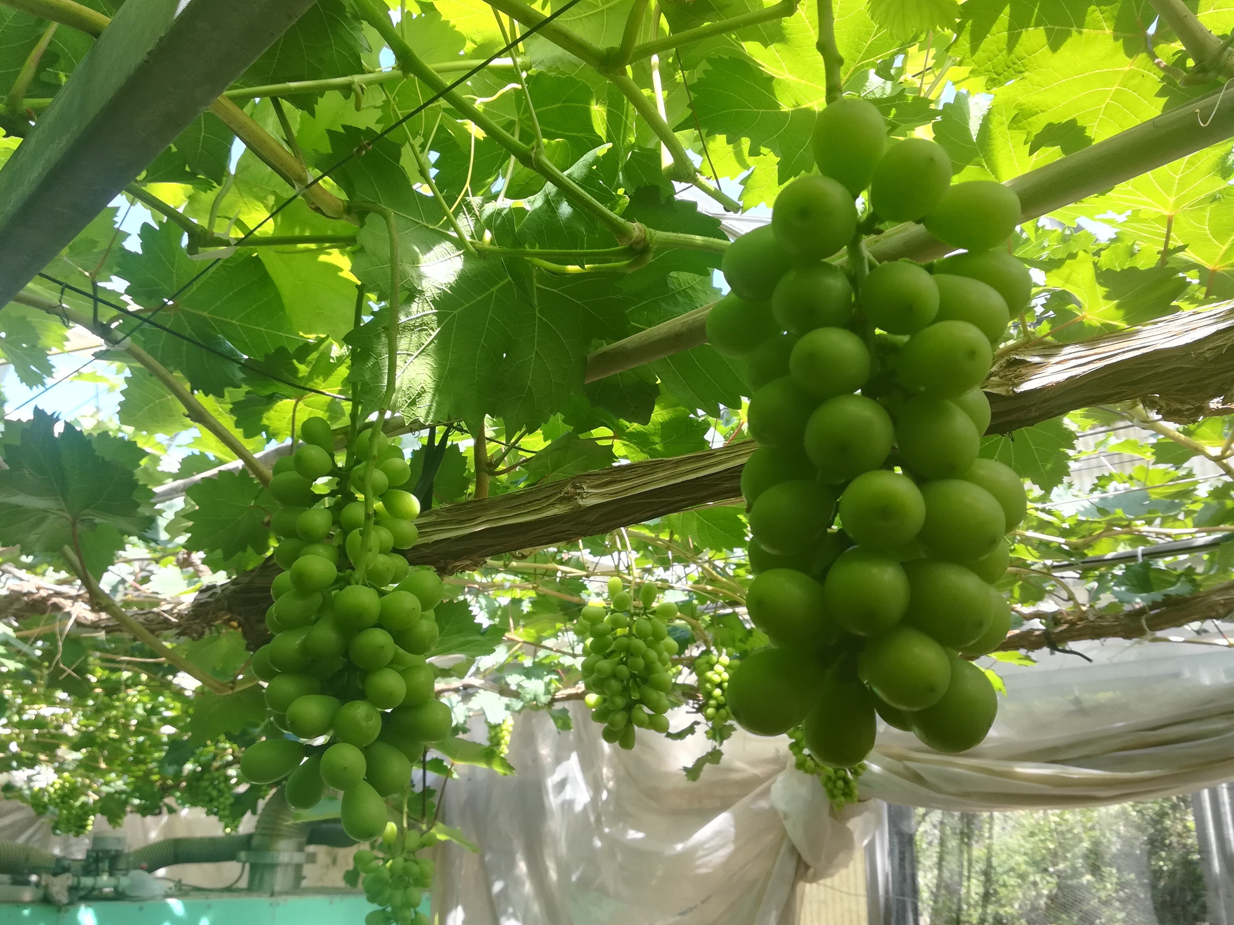 社長の大内です。希少品種の「緑宝」、すくすく育っています。この時期はとにかくハウス内の温度管理に気を使います。高温になりすぎないよう、つきっきりでハウスのビニールを開け閉めして管理します。房も間引き(余計な粒を切りとる)を行って、育った時の形をよくする作業をまる1日行っています。みなさまに少しでも良いぶどうをおとどけできるよう、がんばっています!!ありがとうございます。あと10日あまりになりましたが、ぜひお知り合いにも広めていただき、買って、応援してください^^