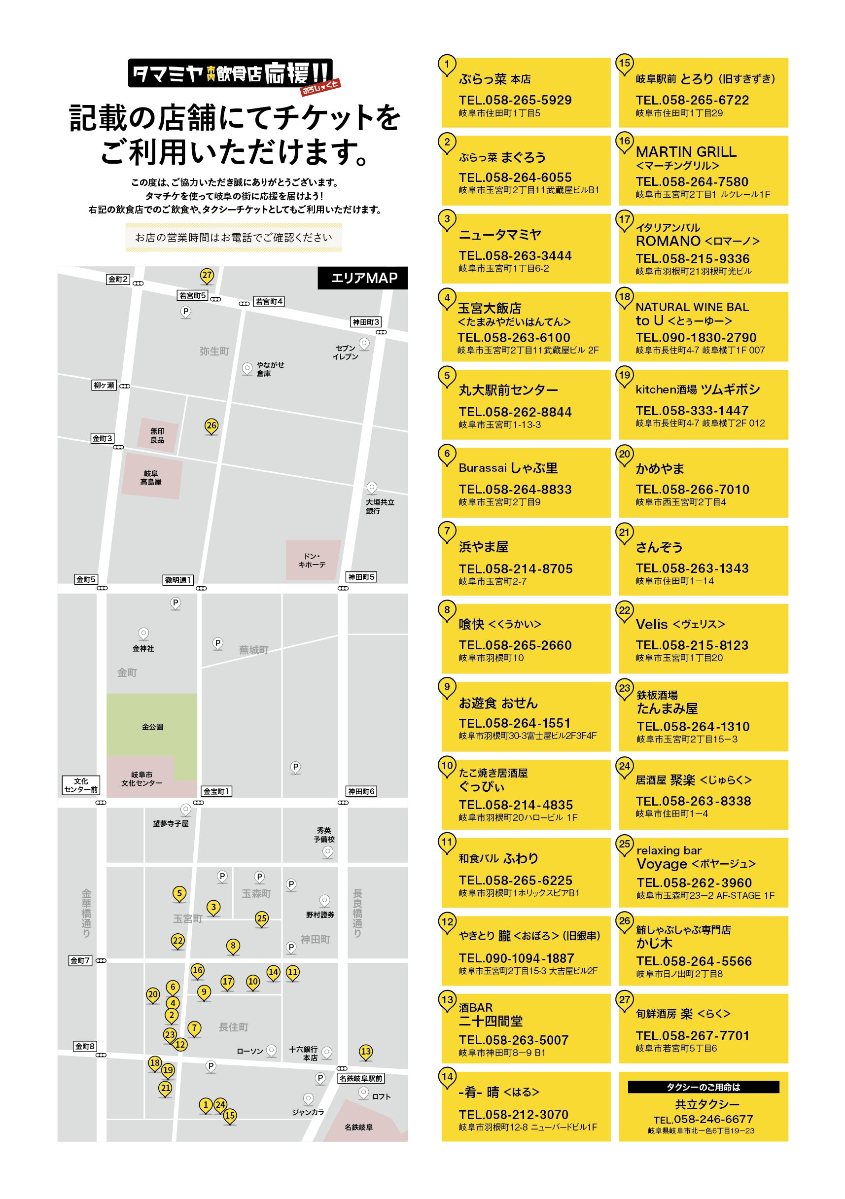 7/5(日)18:00~20:00場所:居酒屋 喰快 くうかい住所:岐阜県岐阜市羽根町10会費:お一人さま4000円 (飲み放題・コース料理)申込フォーマットクラウドファンディングは6月17日を終了し、タマチケ郵送を進めていますので今しばらくお待ちください。さて、クラウドファンディング立ち上げ当初はどうなる事かと思っていましたが、多くの方のご支援を頂き感謝しています。そこで支援頂いた皆様に直接感謝を伝えたい、そして是非お会いしたい思いから支援OFF会を開催する事にしました。今回の食事会もタマミヤ支援となりますので、会費のご負担がございますが、ご了承の程よろしくお願い致します。注)今回の会ではタマチケ利用はご遠慮願います。タマチケに関しては参加店舗さんに満遍なくご利用頂きたいのでご理解宜しくお願いします。参加希望の方は申込フォームにご記入ください。支援頂いた皆さんにお会い出来る事を心から願っています。■主催参加■居酒屋 喰快オーナー 西山誠支援オンライン居酒屋代表 矢崎公大世界のタマミヤプロジェクト プロデューサーRYUREX from MEGARYU