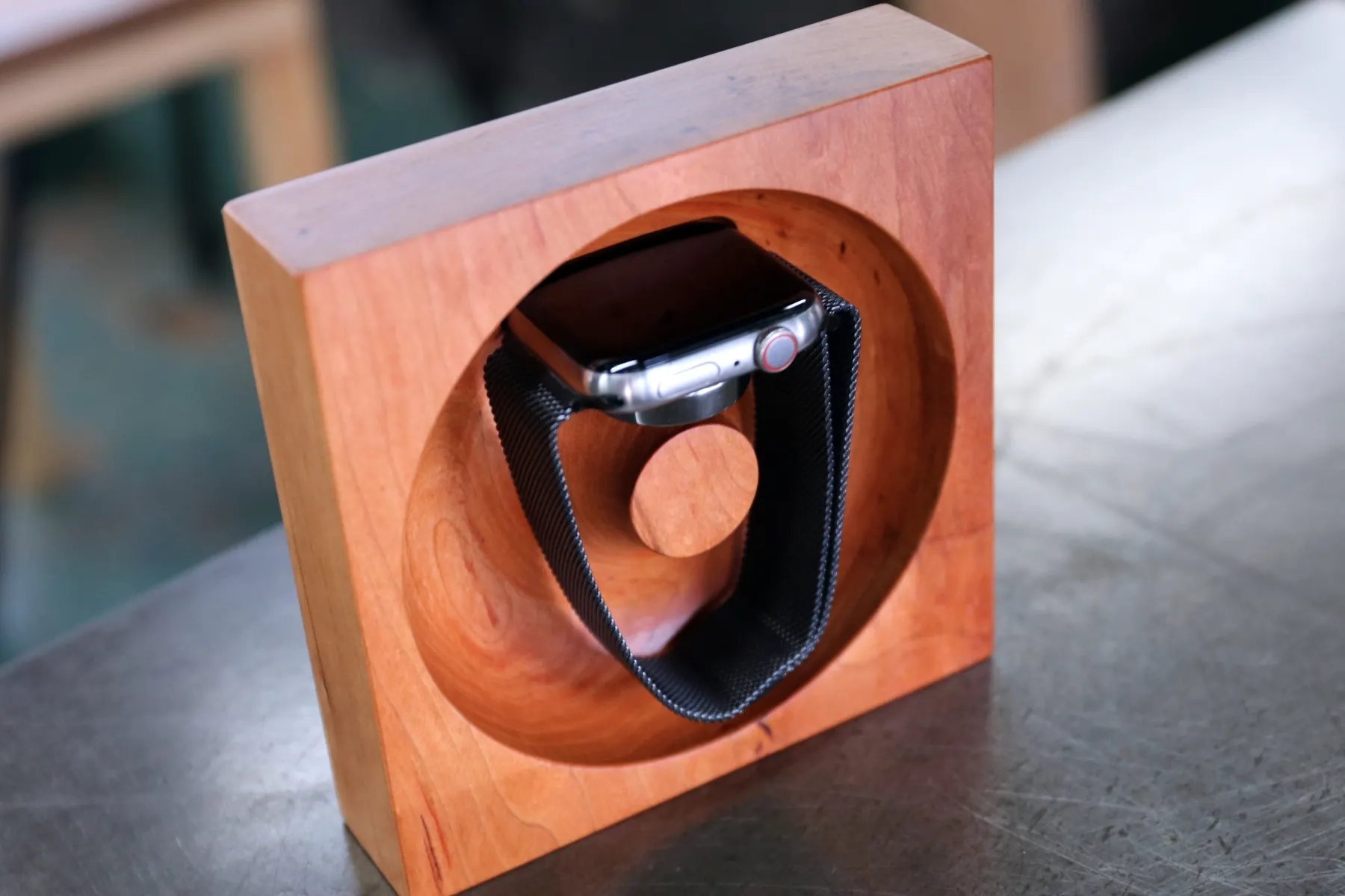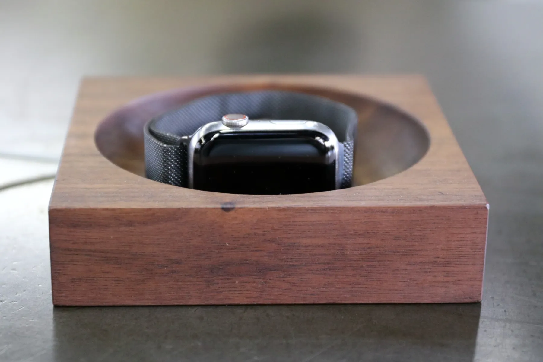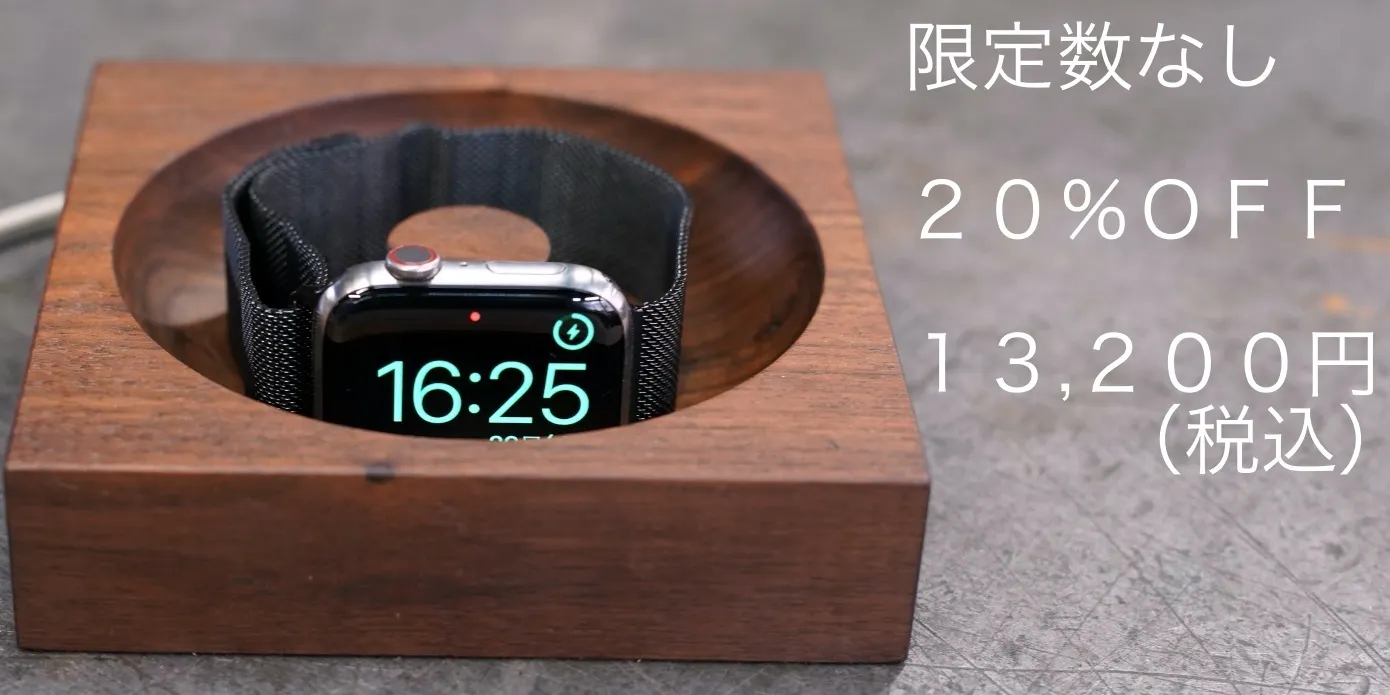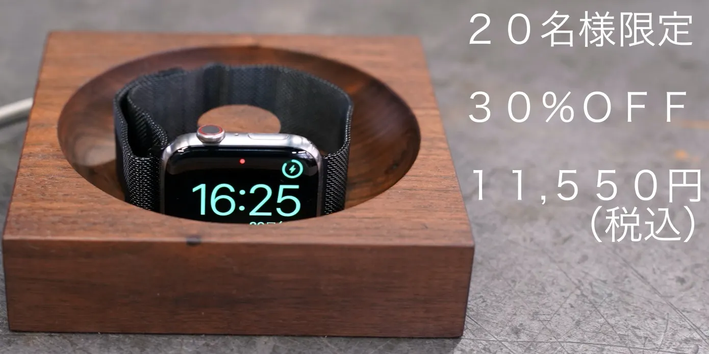 無垢材を削り出した、高級感溢れるスマートウォッチ木製充電台です。
