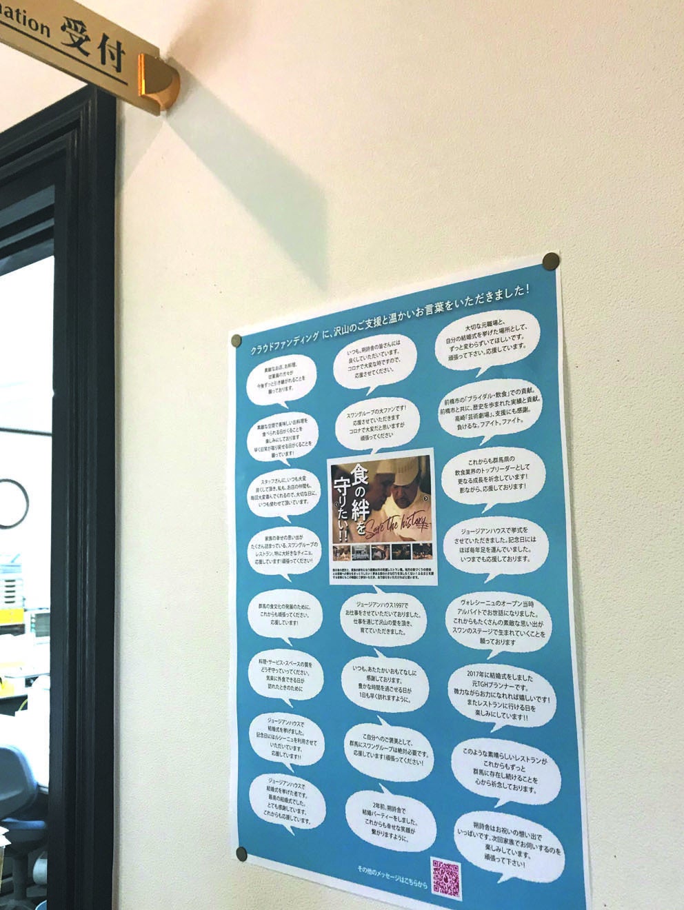 開始早々から、たくさんのお客様と関係者皆様にご支援をいただきました。本当にありがとうございます。プロジェクト終了まであと2週間、ご支援いただいた皆様のお名前は、プロジェクト終了まで私たちが知ることができませんが、皆様からの応援メッセージは確認できており、本当に勇気づけられております。この度、そのメッセージをスタッフ全員が共有できるようにポスターにして全店に配布致しました。プロジェクト期間中に緊急事態措置も解除され、自粛していた店舗も7月1日より再開となり、スワンのレストラン全店舗営業開始となりました。再開にあたっては、客席の間隔をあけ、衛生や換気にも十分留意しております。リターンのお食事券は、スワンの10のカフェやレストランをお得にご利用頂けるチャンスでもあります。この機会をどうぞご利用頂きまして、スワンの味巡りをお楽しみください。スタッフ一同、お店にお待ちしております。