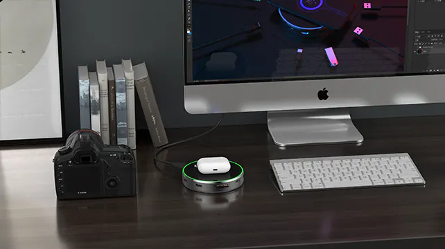 さらに5/10/15WのQi充電もサポートしているので、ワイヤレスでハブに乗せるだけでスマホやAirpodsなど、Qi充電に対応したデバイスの充電ができます。