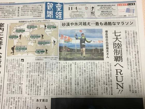2017/11/10 17:1411月5〜9日の5日間にわたり行われた「Ultra Africa Race」に出場し、3位でゴールしました! 強い日差しと暑さに苦しみ、アフリカの自然環境に体調を崩し、永遠と続く砂のコースにもがき続けるレースとなりましたが、 みなさまのおかげで、チャレンジをすることができ、思い切って走ることができました。 ありがとうございます! そして、このアフリカ大会の完走をもって、「日本人初の世界7大陸アドベンチャーマラソン走破」も達成することができました! 本当にありがとうございます!! こうして、自分の目指す目標に向かって、人生を賭けて挑戦できていることが、幸せです。 この挑戦について、産経新聞(11月4日 夕刊1面)に載せていただきました。よろしければどうぞご覧ください。 もっと見るご支援ありがとうございます!!