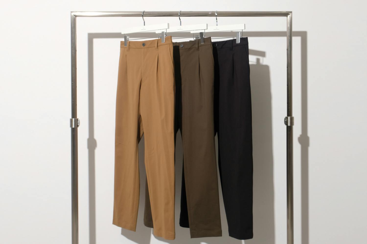 ウエスト周りはタックを施し後ろはゴム仕様の緩やかでリラクシングながら、裾にかけて細くなるテーパードシルエットにより美しいシルエットもキープ。