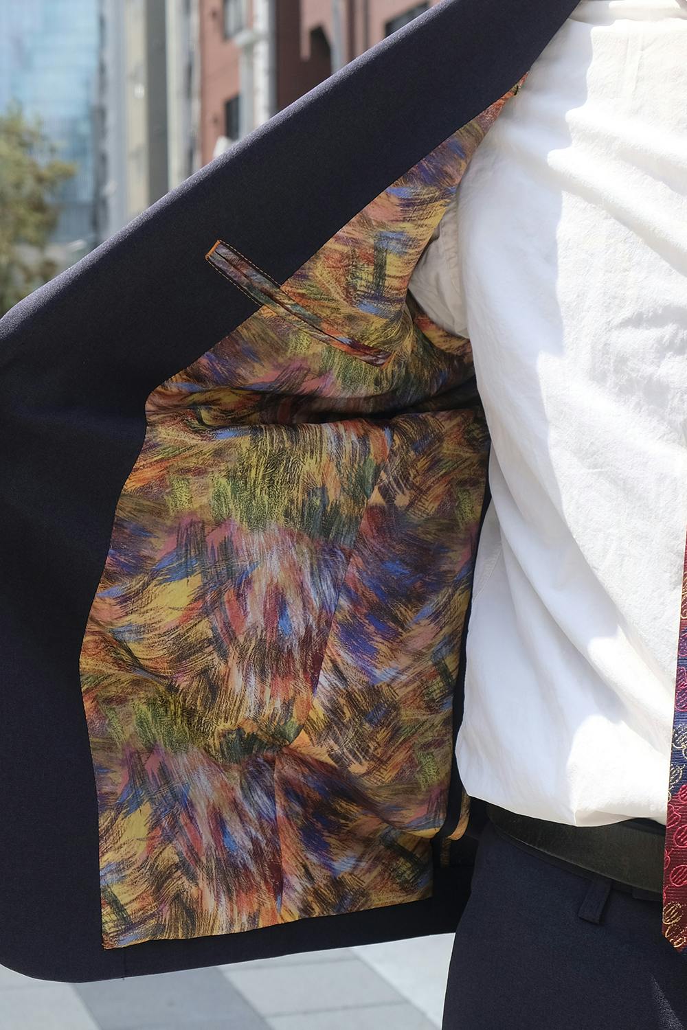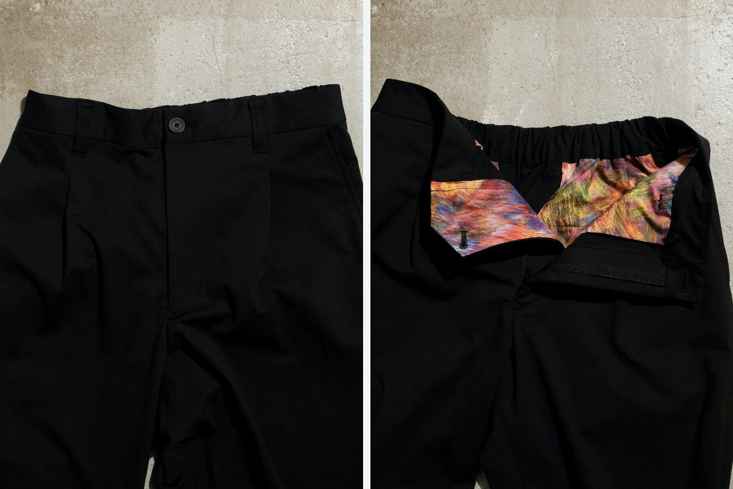ヘラルボニーと繋がりのあるアーティスト高橋南さんの作品「風のロンド」を、スラックス裏地・ポケット布に採用。