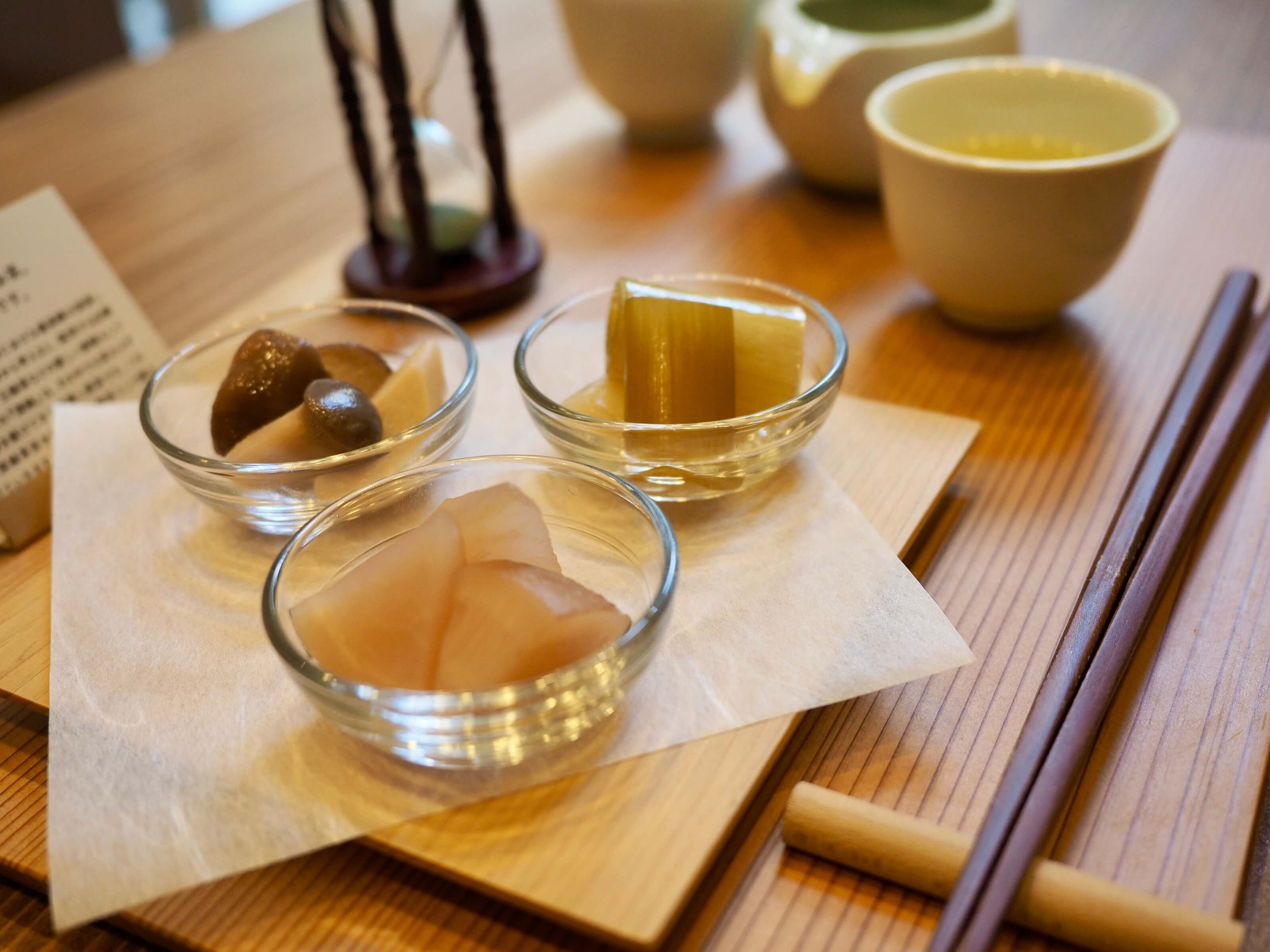 深緑茶房名古屋ではお茶請けは自家製の和菓子だけでなく、新しいお茶請けとして「レア・ドライフルーツ」と「和ピクルス」をご用意しています。どちらも季節のものをご用意し、新しくもどこか懐かしいペアリングをお店ではお楽しみいただいています。